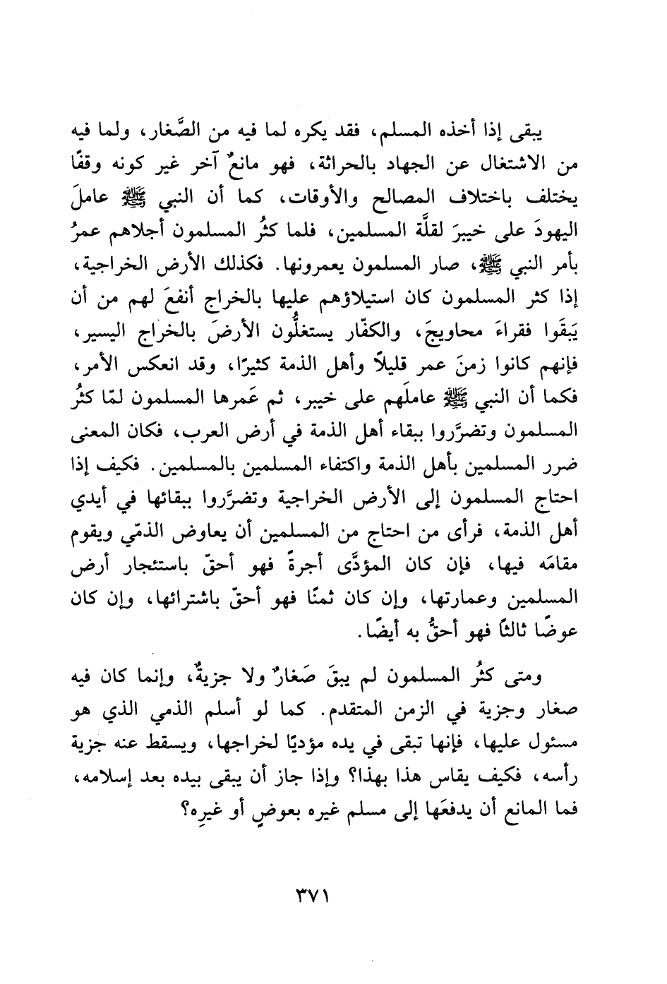 يبقى إذا أخذه المسلم، فقد يكره لما فيه من الصَّغار، ولما فيه من الاشتغال عن الجهاد بالحراثة، فهو مانعٌ آخر غير كونه وقفًا يختلف باختلاف المصالح والأوقات، كما أن النبي - صَلَّى اللَّهُ عَلَيْهِ وَسَلَّمَ - عاملَ اليهودَ على خيبرَ لقلّة المسلمين، فلما كثُر المسلمون أجلاهم عمرُ بأمر النبي- - صَلَّى اللَّهُ عَلَيْهِ وَسَلَّمَ -، صار المسلمون يعمرونها. فكذلك الأرض الخراجية، إذا كثر المسلمون كان استيلاؤهم عليها بالخراج أنفعَ لهم من أن يَبقَوا فقراءَ محاويجَ، والكفّار يستغلُّون الأرضَ بالخراج اليسير، فإنهم كانوا زمنَ عمر قليلاً وأهل الذمة كثيرًا، وقد انعكس الأمر، فكما أن النبي - صَلَّى اللَّهُ عَلَيْهِ وَسَلَّمَ - عاملَهم على خيبر، ثم عَمرها المسلمون لفا كثُر المسلمون وتضرَّروا ببقاء أهل الذمة في أرض العرب، فكان المعنى ضرر المسلمين بأهل الذمة واكتفاء المسلمين بالمسلمين. فكيف إذا احتاج المسلمون إلى الأرض الخراجية وتضرّروا ببقائها في أيدي أهل الذمة، فرأى من احتاج من المسلمين أن يعاوض الذمّي ويقوم مقامَه فيها، فإن كان المؤدَّى أجرةً فهو أحق باستئجار أرض المسلمين وعمارتها، وإن كان ثمنًا فهو أحق باشترائها، وإن كان عوضًا ثالثاً فهو أحق به أيضًا.
