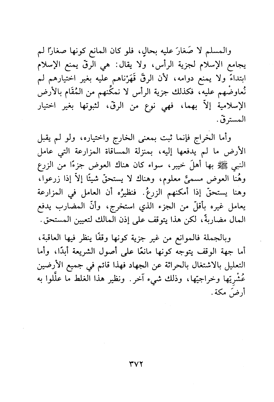 وبالجملة فالموانع من غير جزية كونها وقفا ينظر فيها العاقبة، أما جهة الوقف يتوجه كونها مانعًا على أصول الشريعة أبدًا، وأما التعليل بالاشتغال بالحراثة عن الجهاد فهذا قائم في جميع الأرضين عُشْرِيّها وخراجيّها، وذلك شيء آخر. ونظير هذا الغلط ما علَّلوا به أرضَ مكة.