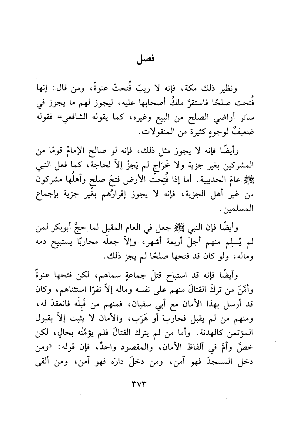 وأيضًا فإن النبي - صَلَّى اللَّهُ عَلَيْهِ وَسَلَّمَ - جعل في العام المقبل لما حجَّ أبو بكر لمن لم يُسلِم منهم أجلَ أربعة أشهر، وإلاّ جعلَه محاربًا يستبيح دمه وماله، ولو كان قد فتحها صلحًا لم يجز ذلك.