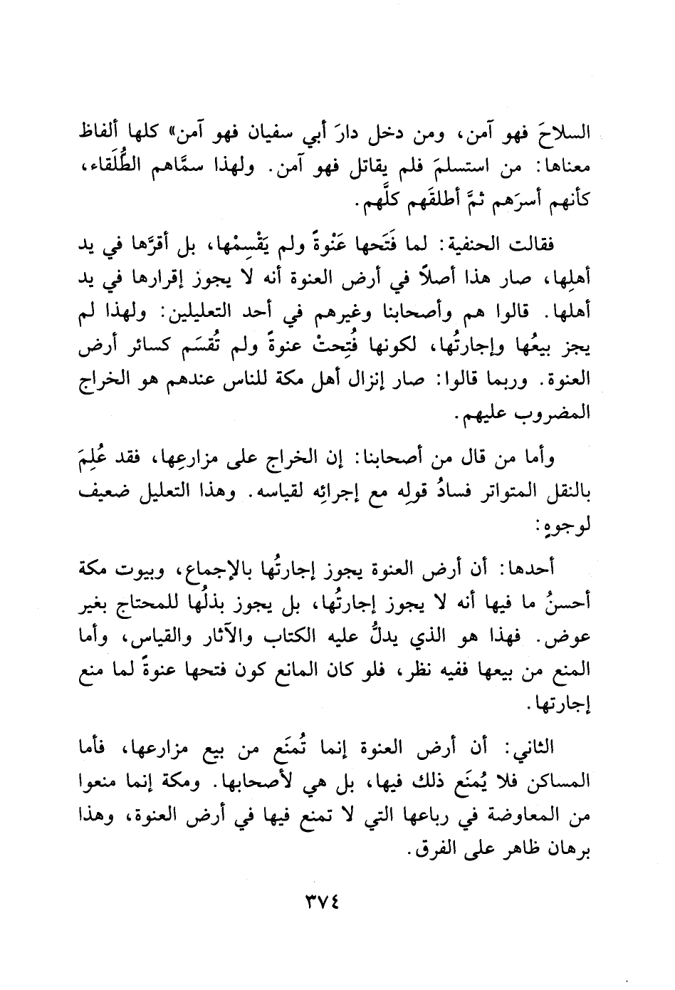 أحدها: أن أرض العنوة يجوز إجارتُها بالإجماع، وبيوت مكة أحسنُ ما فيها أنه لا يجوز إجارتُها، بل يجوز بذلُها للمحتاج بغير عوض. فهذا هو الذي يدكُ عليه الكتاب والآثار والقياس، وأما المنع من بيعها ففيه نظر، فلو كان المانع كون فتحها عنوةً لما منع إجارتها.
