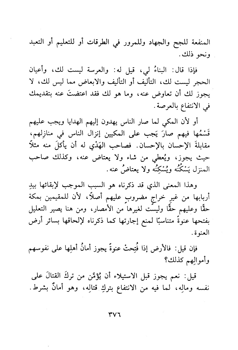 وهذا المعنى الذي قد ذكرناه هو السبب الموجب لإبقائها بيدِ أربابها من غيرِ خراجٍ مضروب عليهم أصلاً، لأن للمقيمين بمكة حقًّا وعليهم حقًّا وليست لغيرها من الأمصار، ومن هنا يصير التعليل بفتحها عنوةً متناسبًا لمنع إجارتها كما ذكرناه لإلحاقها بسائر أرض العنوة.