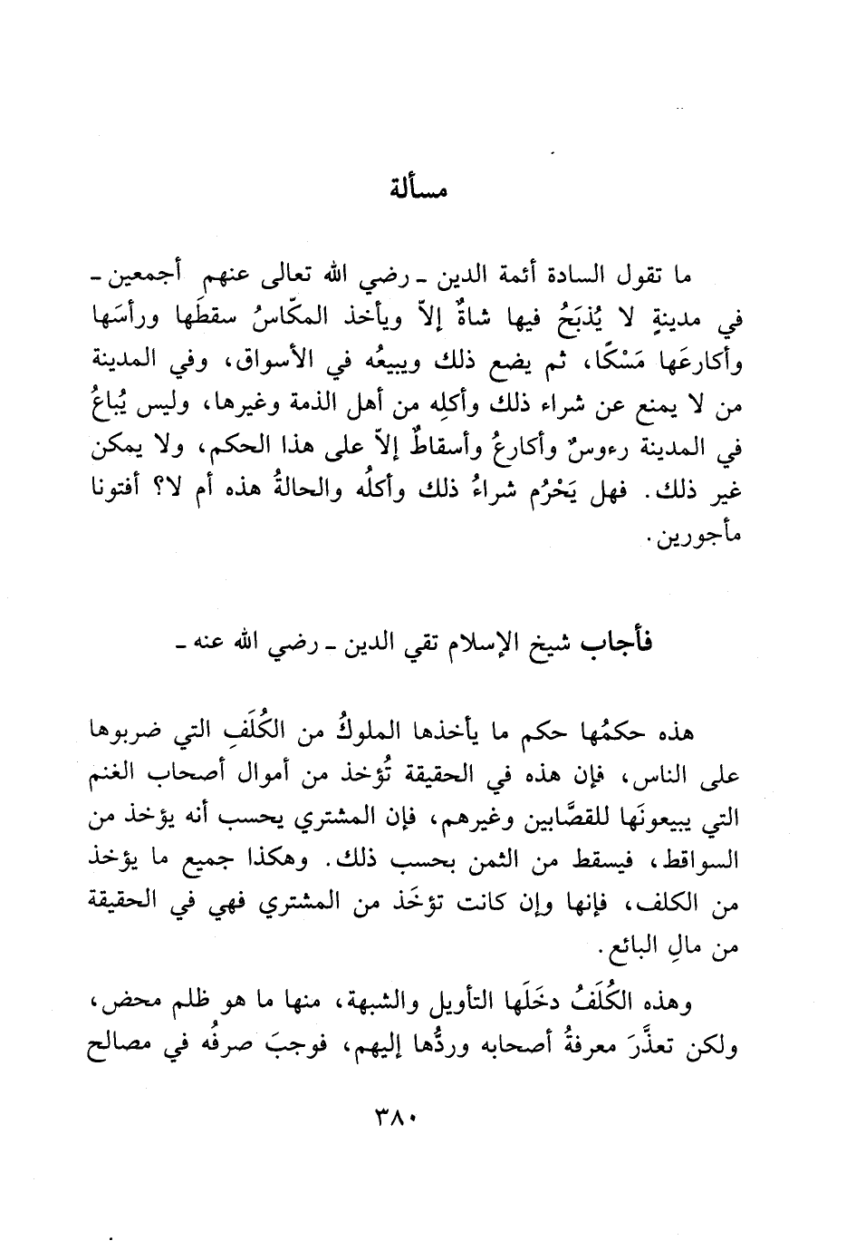 فأجاب شيخ الإسلام تقي الدين -رضي الله عنه- هذه حكمُها حكم ما يأخذها الملوكُ من الكُلَفِ التي ضربوها على الناس، فإن هذه في الحقيقة تُؤخذ من أموال أصحاب الغنم التي يبيعونَها للقصابين وغيرهم، فإن المشتري يحسب أنه يؤخذ من السواقط، فيسقط من الثمن بحسب ذلك. وهكذا جميع ما يؤخذ من الكلف، فإنها وإن كانت تؤخَذ من المشتري فهي في الحقيقة من مالِ البائع.