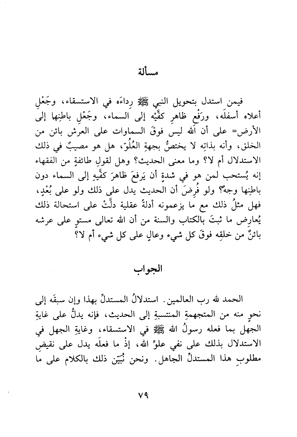 فيمن استدل بتحويل النبي - صَلَّى اللَّهُ عَلَيْهِ وَسَلَّمَ - رِداءَه في الاستسقاء، وجَعْلِ أعلاه أسفلَه، ورَفْعِ ظاهرِ كفيْه إلى السماء، وجَعْلِ باطنِها إلى الأرض= على أن الله ليس فوقَ السماوات على العرش بائن من الخلق، وأنه بذاتِه لا يختصُّ بجهةِ العُلُوّ، هل هو مصيبٌ في ذلك الاستدلال أم لا؟ وما معنى الحديث؟ وهل لقولِ طائفةٍ من الفقهاء إنه يُستحب لمن هو في شدةٍ أن يَرفعَ ظاهرَ كفَّيهِ إلى السماء دون باطنِها وجهٌ؟ ولو فُرِضَ أن الحديث يدل على ذلك ولو على بُعْدٍ، فهل مثلُ ذلك مع ما يزعمونه أدلةً عقلية دلَّتْ على استحالة ذلك يُعارِض ما ثبتَ بالكتاب والسنة من أن الله تعالى مستوٍ على عرشه بائنٌ من خلقِه فوقَ كل شيء وعالٍ على كل شيء أم لا؟