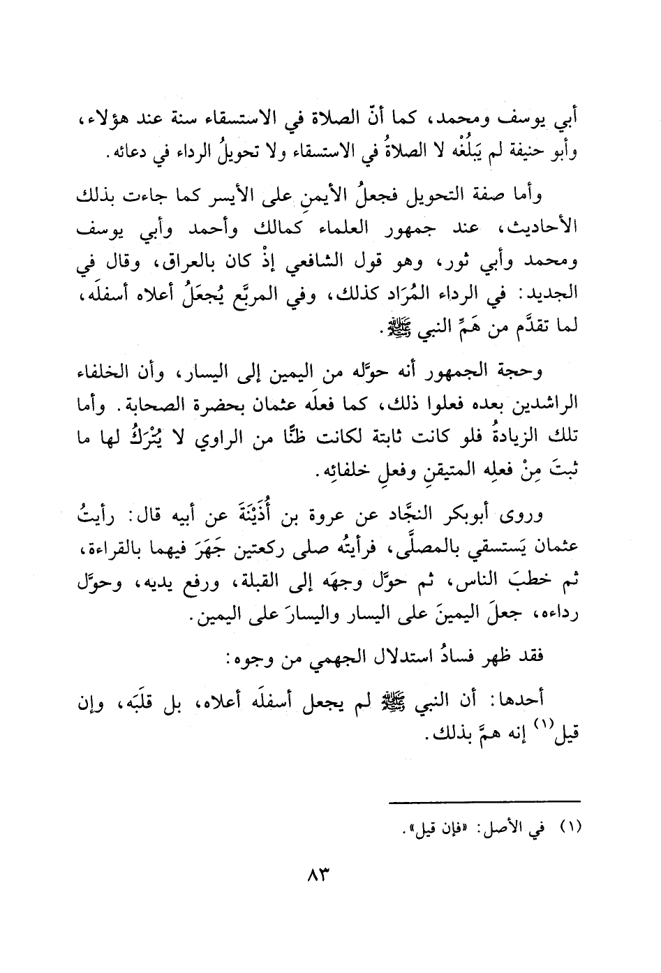 وحجة الجمهور أنه حوَّله من اليمين إلى اليسار، وأن الخلفاء الراشدين بعده فعلوا ذلك، كما فعلَه عثمان بحضرة الصحابة. وأما تلك الزيادةُ فلو كانت ثابتة لكانت ظنَّا من الراوي لا يتركُ لها ما ثبتَ مِنْ فعلِه المتيقنِ وفعلِ خلفائِه.