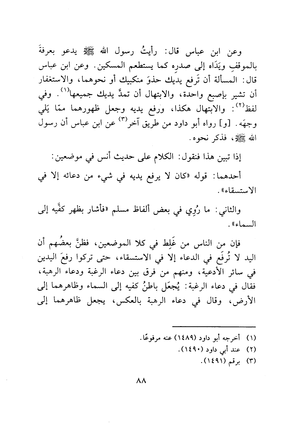وعن ابن عباس قال: رأيتُ رسول الله - صَلَّى اللَّهُ عَلَيْهِ وَسَلَّمَ - يدعو بعرفةَ بالموقفِ ويَدَاه إلى صدرِه كما يستطعم المسكين. وعن ابن عباس قال: المسألة أن تَرفع يديك حذوَ منكبيك أو نحوهما، والاستغفار أن تشير بإصبع واحدة، والابتهال أن تمدَّ يديك جميعها (1). وفي لفظ (2): والابتهال هكذا، ورفع يديه وجعل ظهورهما ممّا يَلي وجهَه. [و] رواه أبو داود من طريق آخر (3) عن ابن عباس أن رسول الله - صَلَّى اللَّهُ عَلَيْهِ وَسَلَّمَ -، فذكر نحوه.
