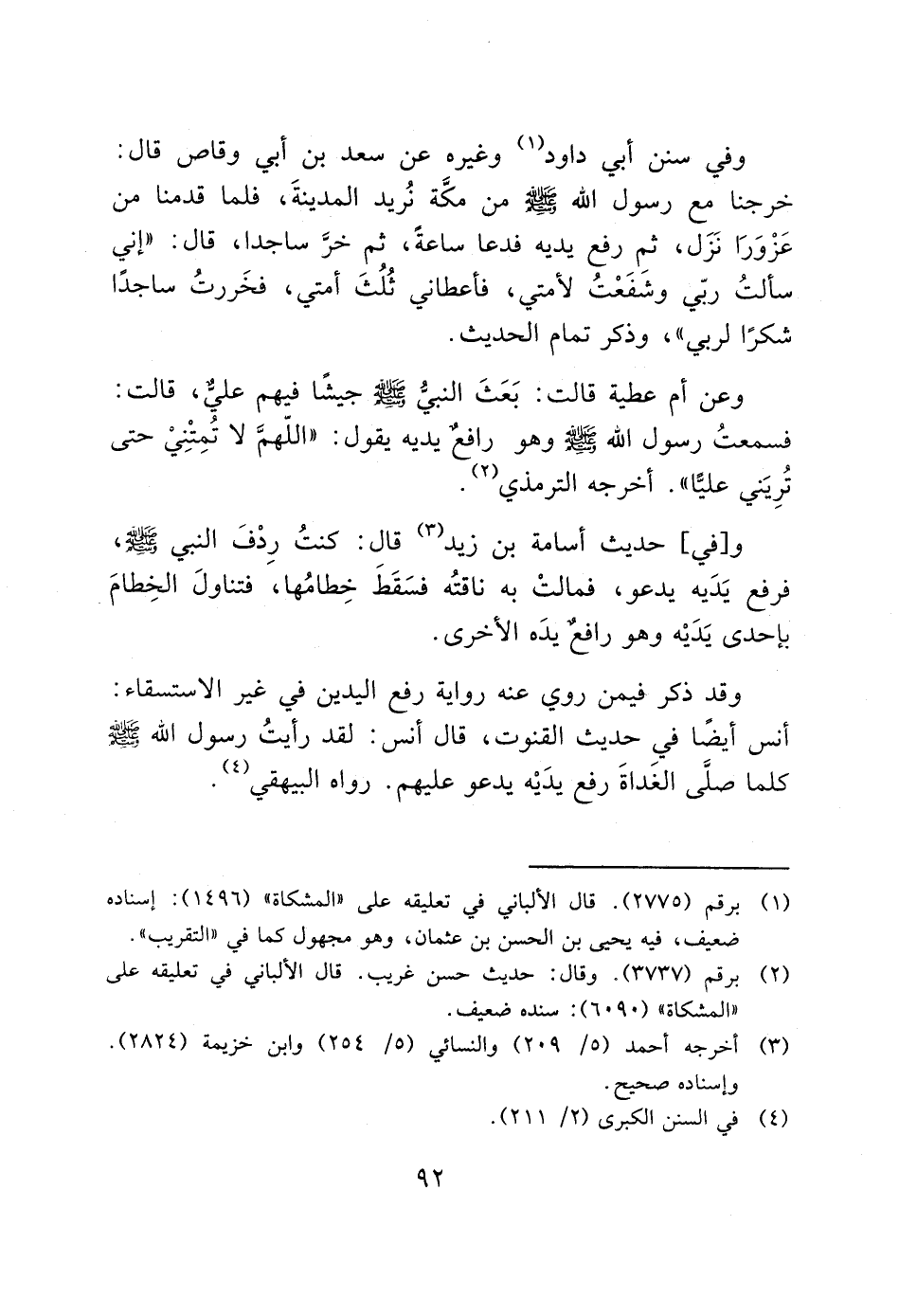 وقد ذكر فيمن روي عنه رواية رفع اليدين في غير الاستسقاء: أنس أيضا في حديث القنوت، قال أنس: لقد رأيتُ رسول الله - صَلَّى اللَّهُ عَلَيْهِ وَسَلَّمَ - كلما صلَّى الغَداةَ رفع يدَيْه يدعو عليهم. رواه البيهقي (4).