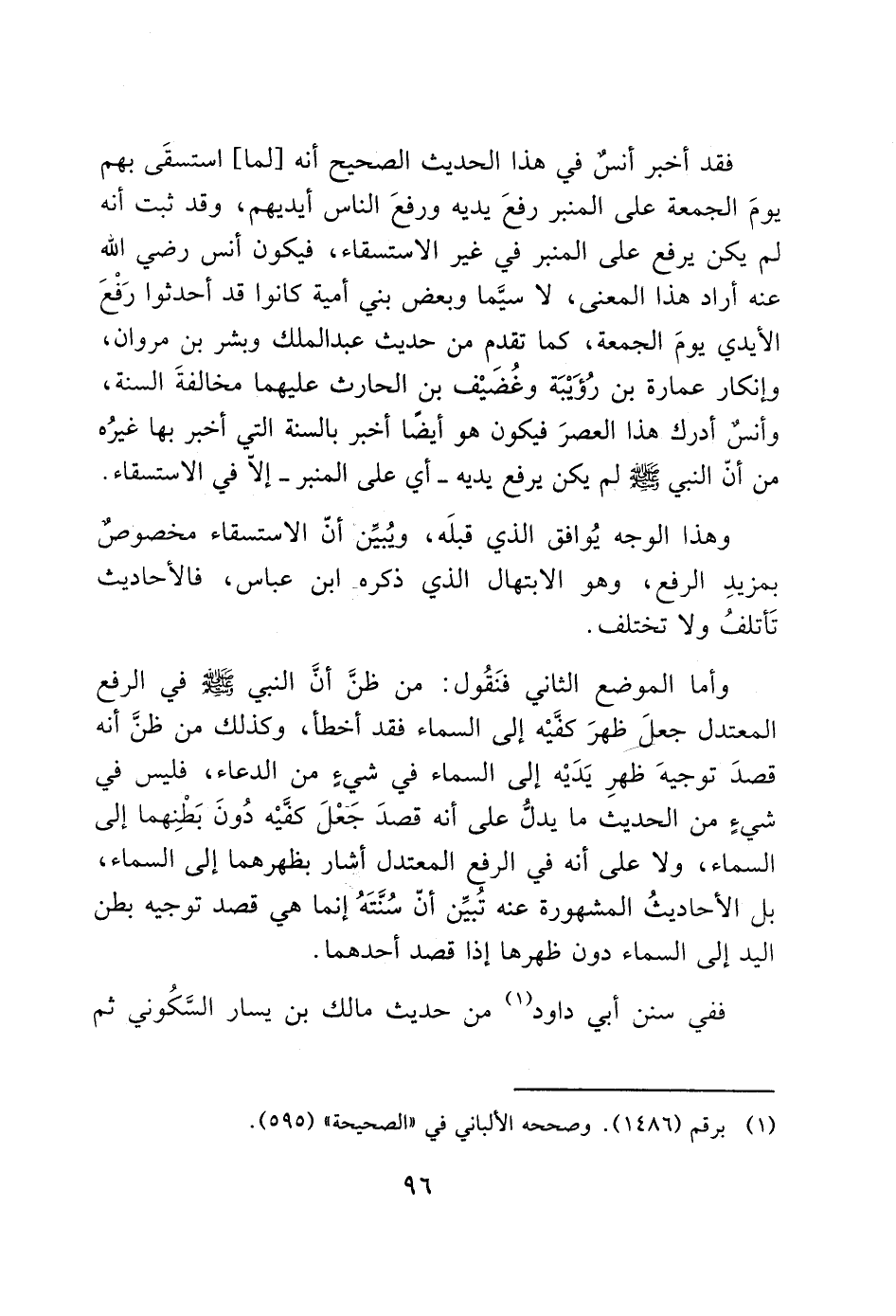 وأما الموضع الثاني فنَقُول: من ظنَ أن النبي - صَلَّى اللَّهُ عَلَيْهِ وَسَلَّمَ - في الرفع المعتدل جعلَ ظهرَ كفَّيْه إلى السماء فقد أخطأ، وكذلك من ظنَ أنه قصدَ توجيهَ ظهرِ يَدَيْه إلى السماء في شيء من الدعاء، فليس في شيءٍ من الحديث ما يدلُّ على أنه قصدَ جَعْلَ كفيْه دُونَ بَطْنِهما إلى السماء، ولا على أنه في الرفع المعتدل أشار بظهرهما إلى السماء، بل الأحاديثُ المشهورة عنه تُبين أنّ سُنَّتَهُ إنما هي قصد توجيه بطن اليد إلى السماء دون ظهرها إذا قصد أحدهما.