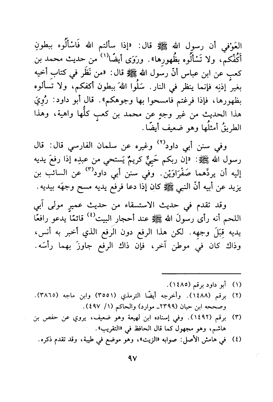 العَوْفي أن رسول الله - صَلَّى اللَّهُ عَلَيْهِ وَسَلَّمَ - قال: "إذا سألتم الله فَاسْألوه ببطونِ أَكُفكم، ولا تَسْألوه بظُهورِها". ورَوَى أيضًا (1) من حديث محمد بن كعب عن ابن عباس أن رسول الله - صَلَّى اللَّهُ عَلَيْهِ وَسَلَّمَ - قال: "من نَظَر في كتاب أخيه بغير إذنِه فإنما ينظر في النار. سَلُوا اللهَ ببطون أكفكم، ولا تَسألوه بظهورها، فإذا فرغتم فامسحوا بها وجوهكم". قال أبو داود: رُوِيَ هذا الحديث من غير وجهٍ عن محمد بن كعبٍ كلُّها واهية، وهذا الطريقُ أمثلُها وهو ضعيف أيضًا.