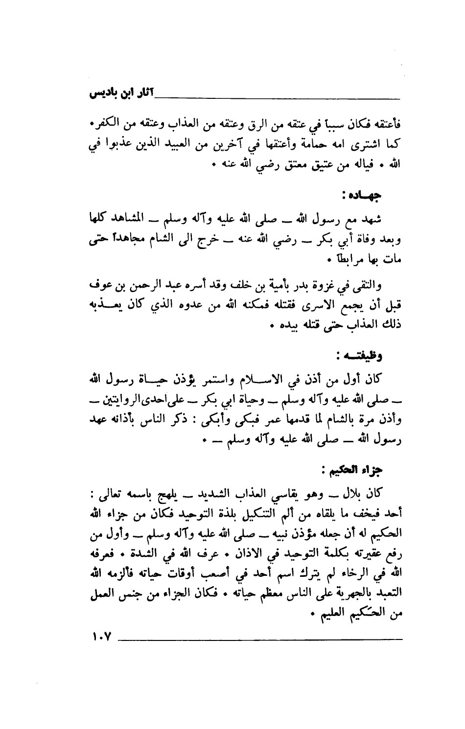 كان بلال- وهو يقاسي العذاب الشديد- يلهج باسمه تعالى: "أحد" فيخف ما يلقاه من ألم التنكيل بلذة التوحيد فكان من جزاء الله الحكيم له أن جعله مؤذن نبيه - صلى الله عليه وآله وسلم- وأول من رفع عقيرته بكلمة التوحيد في الآذان. عرف الله في الشدة. فعرفه الله في الرخاء لم يترك اسم أحد في أصعب أوقات حياته فألزمه الله التعبد بالجهرية على الناس معظم حياته. فكان الجزاء من جنس العمل من الحكيم العليم.