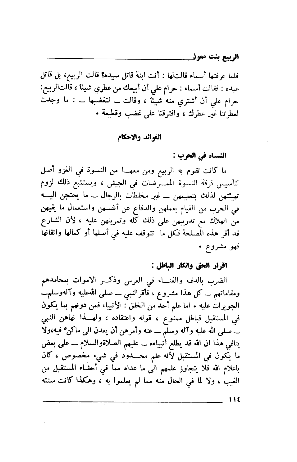 فلما عرفتها أسماء قالت لها: أنت ابنة قاتل سيده؟ قالت الربيع، بل قاتل عبده: فقالت أسماء: حرام علي أن أبيعك من عطري شيئاً، قالت الربيع: حرام على أن أشتري منه شيئاً، وقالت- لتغضبها-: ما وجدت لعطرتنا نمير عطرك، وافترقتا على غضب وقطيعة.
