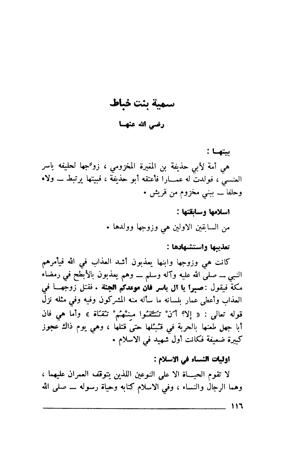 كانت هي وزوجها وابنها يعذبون أشد العذاب في الله فيأمرهم النبي- صلى الله عليه وآله وسلم- وهم يعذبون بالأبطح في رمضاء مكة فيقول: «صبراً يا آل ياسر فإن موعدكم الجنة». فقتل زوجها في العذاب وأعطى عمار بلسانه ما سأله منه المشركون وفيه وفي مثله نزل قوله تعالى: {إِلَّا أَنْ تَتَّقُوا مِنْهُمْ تُقَاةً} وأما هي فإن أبا جهل طعنها بالحربة في قُبُلها حتى قتلها، وهي يوم ذاك عجوز كبيرة ضعيفة فكانت أول شهيد في الإسلام.