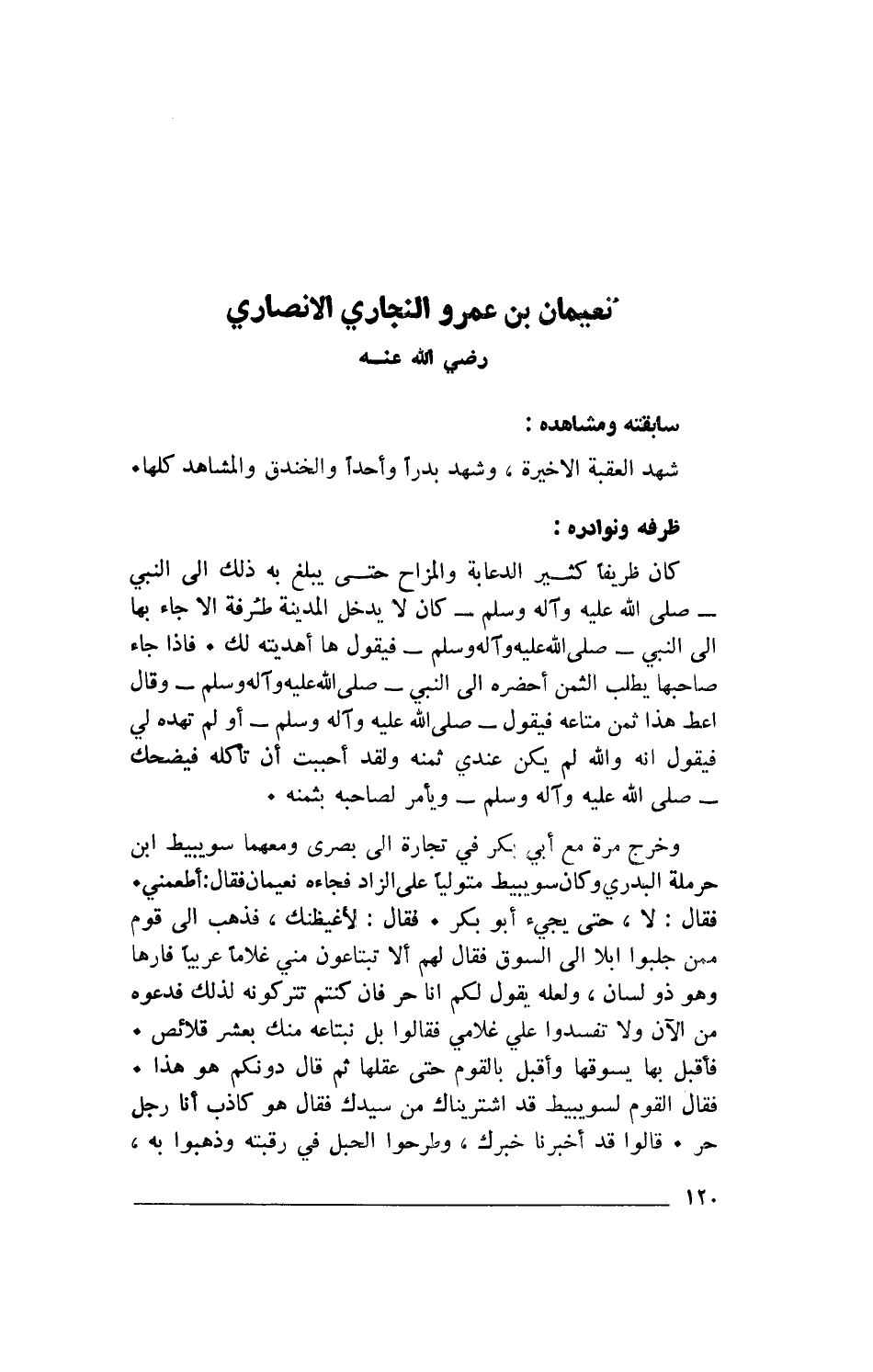 وخرج مرة مع أبي بكر في تجارة إلى بصرى ومعهما سويبيط ابن حرملة البدري وكان سويبيط متولياً على الزاد فجاءه نعيمان فقال: أطعمني. فقال: لا، حتى يجيء أبو بكر. فقال: لأغيظنك، فذهب إلى قوم ممن جلبوا إبلا إلى السوق فقال لهم ألا تبتاعون مني غلاماً عربياً فارها وهو ذو لسان، ولعله يقول لكم أنا حر فإن كنتم تتركونه لذلك فدعوه من الآن ولا تفسدوا علي غلامي فقالوا بل نبتاعه منك بعشر قلائص. فأقبل بها يسوقها وأقبل بالقوم حتى عقلها ثم قال دونكم هو هذا. فقال القوم لسويبيط قد اشتريناك من سيدك فقال هو كاذب أنا رجل حر. قالوا قد أخبرنا خبرك، وطرحوا الحبل في رقبته وذهبوا به،