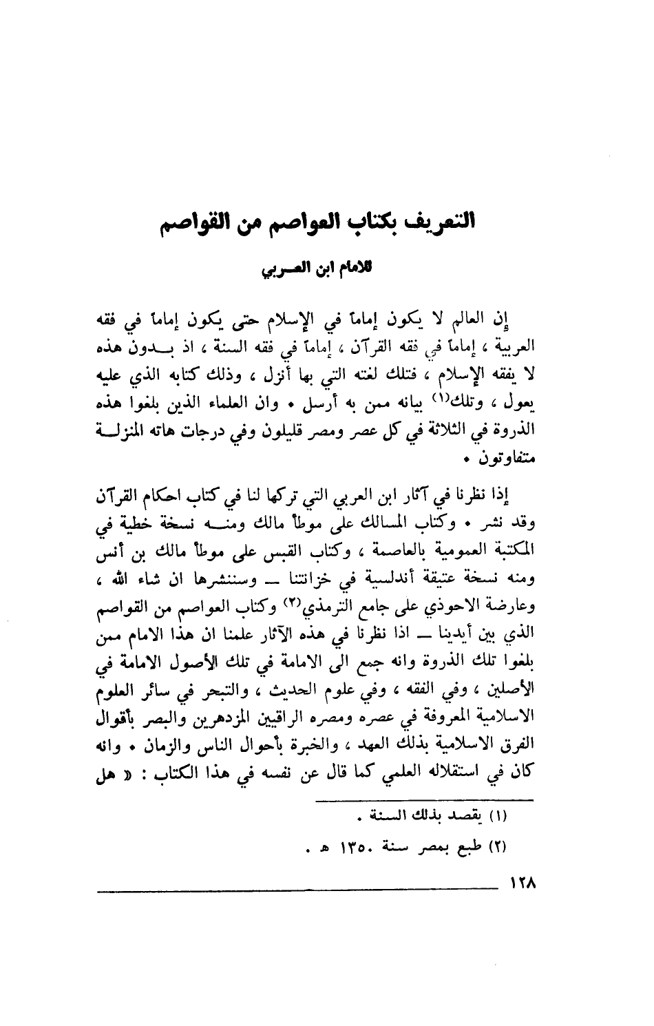 إذا نظرنا في آثار ابن العربي التي تركها لنا في كتاب أحكام القرآن وقد نشر. وكتاب المسالك على موطأ مالك ومنه نسخة خطية في المكتبة العمومية بالعاصمة، وكتاب القبس على موطأ مالك بن أنس ومنه نسخة عتيقة أندلسية في خزانتنا- وسننشرها إن شاء الله، وعارضة الأحوذي على جامع الترمذي (2) وكتاب العواصم من القواصم الذي بين أيدينا- إذا نظرنا في هذه الآثار علمنا أن هذا الإمام ممن بلغوا تلك الذروة وأنه جمع إلى الإمامة في تلك الأصول الإمامة في الأصلين، وفي الفقه، وفي علوم الحديث، والتبحر في سائر العلوم الإسلامية المعروفة في عصره ومصره الراقيين المزدهرين والبصر بأقوال الفرق الإسلامية بذلك العهد، والخبرة بأحوال الناس والزمان. وأنه كان في استقلاله العلمي كما قال عن نفسه في هذا الكتاب: "هل