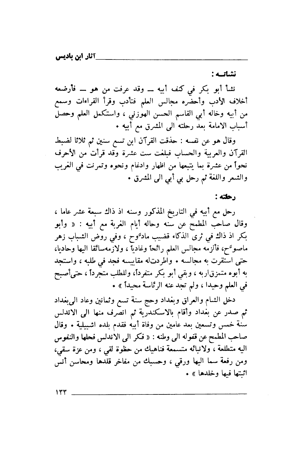نشا أبو بكر في كنف أبيه- وقد عرفت من هو- فأرضعه أخلاف الأدب وأحضره مجالس العلم فتأدب وقرأ القراءات وسمع من أبيه وخاله أبي القاسم الحسن الهوزني، واستكمل العلم وحصل أسباب الإمامة بعد رحلته إلى المشرق مع أبيه.