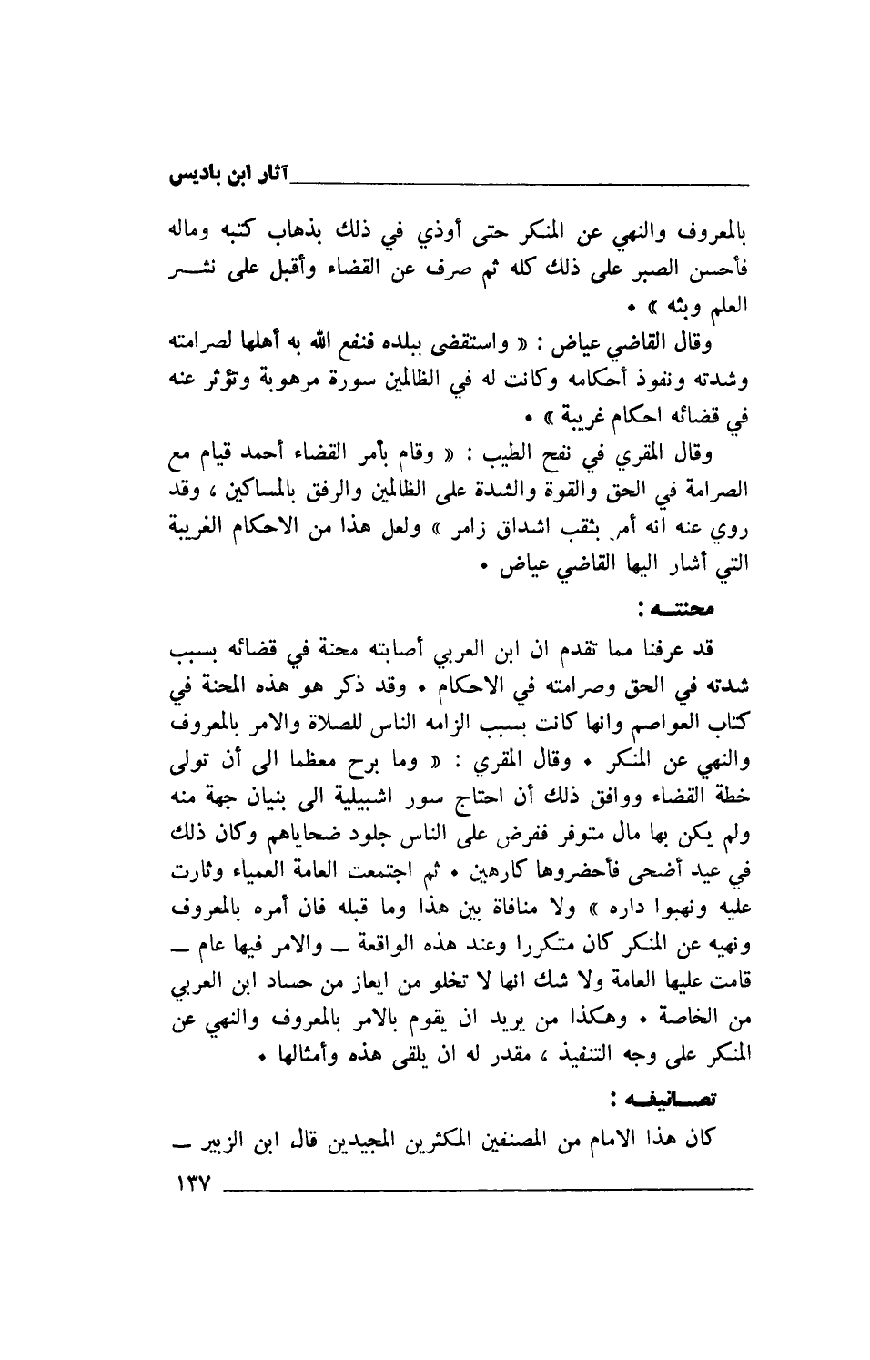 بالمعروف والنهي عن المنكر حتى أوذي في ذلك بذهاب كتبه وماله فأحسن الصبر على ذلك كله ثم صرف عن القضاء وأقبل على نشر العلم وبثه".
