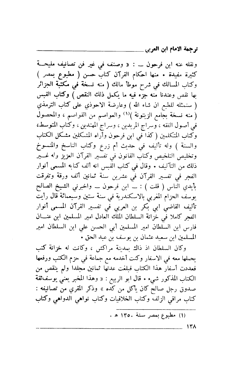 ونقله عنه ابن فرحون-: "وصنف في غير فن تصانيف مليحة كثيرة مفيدة. منها أحكام القرآن كتاب حسن (مطبوع بمصر) وكتاب المسالك في شرح موطأ مالك (منه نسخة في مكتبة الجزائر بها نقص وعندنا منه جزء فيه ما يكمل ذلك النقص) وكتاب القبس (سنمثله للطبع إن شاء الله) وعارضة الأحوذي على كتاب الترمذي (منه نسخة بجامع الزيتونة) (1) والعواصم من القواصم، والمحصول في أصول الفقه، وسراج المريدين، وسراج المهتدين، وكتاب المتوسط، وكتاب المتكلمين (كذا في ابن فرحون وأراه المشكلين مشكل الكتاب والسنة) وله تأليف في حديث أم زرع وكتاب الناسخ والمنسوخ وتخليص التلخيص وكتاب القانون في تفسير القرآن العزيز وله غير ذلك من التآليف. وقال في كتاب القبس أنه ألف كتابه المسمى أنوار الفجر في تفسير القرآن في عشرين سنة ثمانين ألف ورقة وتفرقت بأيدي الناس (قلت): - ابن فرحون- وأخبرني الشيخ الصالح يوسف الحزام المغربي بالإسكندرية في سنة ستين وسبعمائة قال رأيت تأليف القاضي أبي بكر بن العربي في تفسير القرآن المسمى أنوار الفجر كاملا في خزانة السلطان الملك العادل أمير المسلمين ابن عنان فارس ابن السلطان أمير المسلمين أبي الحسن علي ابن السلطان أمير المسلمين ابن سعيد عثمان بن يوسف بن عبد الحق.