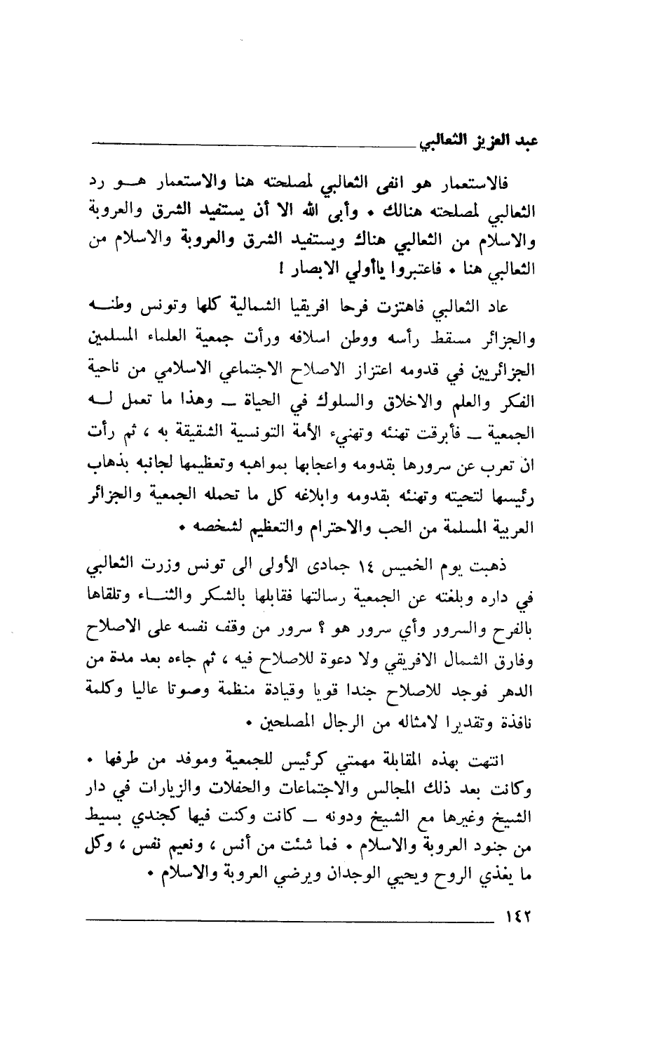 ذهبت يوم الخميس 14 جمادى الأولى إلى تونس وزرت الثعالبي في داره وبلغته عن الجمعية رسالتها فقابلها بالشكر والثناء وتلقاها بالفرح والسرور وأي سرور هو؟ سرور من وقف نفسه على الإصلاح وفارق الشمال الإفريقي ولا دعوة للإصلاح فيه، ثم جاءه بعد مدة من الدهر فوجد للإصلاح جندا قويا وقيادة منظمة وصوتا عاليا وكلمة نافذة وتقديرا لأمثاله من الرجال المصلحين.