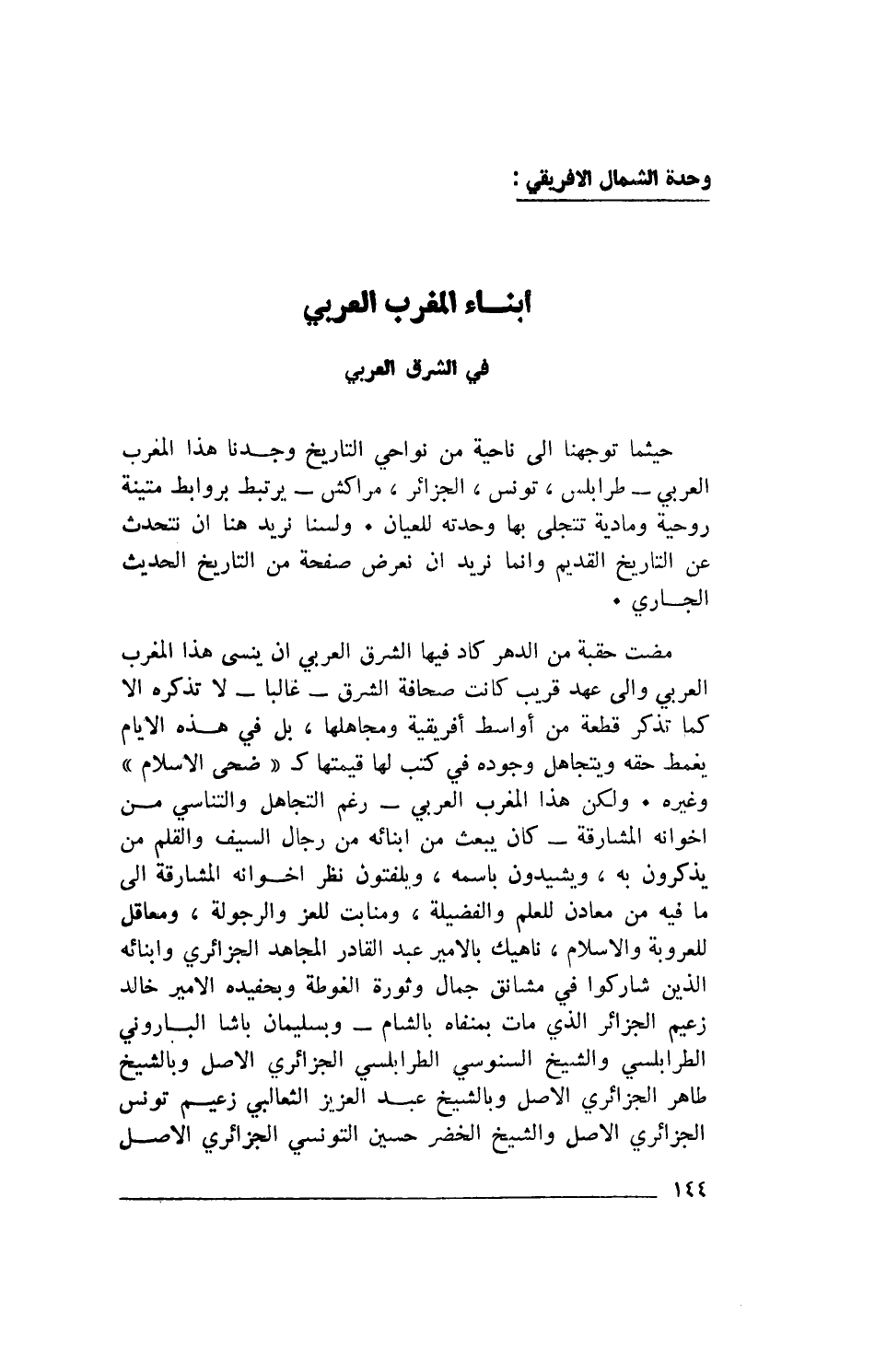 مضت حقبة من الدهر كاد فيها الشرق العربي أن ينسى هذا المغرب العربي وإلى عهد قريب كانت صحافة الشرق- غالبا- لا تذكره إلا كما تذكر قطعة من أواسط أفريقية ومجاهلها، بل في هذه الأيام يغمط حقه ويتجاهل وجوده في كتب لها قيمتها كـ"ضحى الإسلام" وغيره. ولكن هذا المغرب العربي- رغم التجاهل والتناسي من إخوانه المشارقة- كان يبعث من أبنائه من رجال السيف والقلم من يذكرون به، ويشيدون باسمه، ويلفتون نظر إخوانه المشارقة إلى ما فيه من معادن للعلم والفضيلة، ومنابت للعز والرجولة، ومعاقل للعروبة والإسلام، ناهيك بالأمير عبد القادر المجاهد الجزائري وأبنائه الذين شاركوا في مشانق جمال وثورة الغوطة وبحفيده الأمير خالد زعيم الجزائر الذي مات بمنفاه بالشام- وبسليمان باشا الباروني الطرابلسي والشيخ السنوسي الطرابلسي الجزائري الأصل وبالشيخ طاهر الجزائري الأصل وبالشيخ عبد العزيز الثعالبي زعيم تونس الجزائري الأصل والشيخ الخضر حسين التونسي الجزائري الأصل