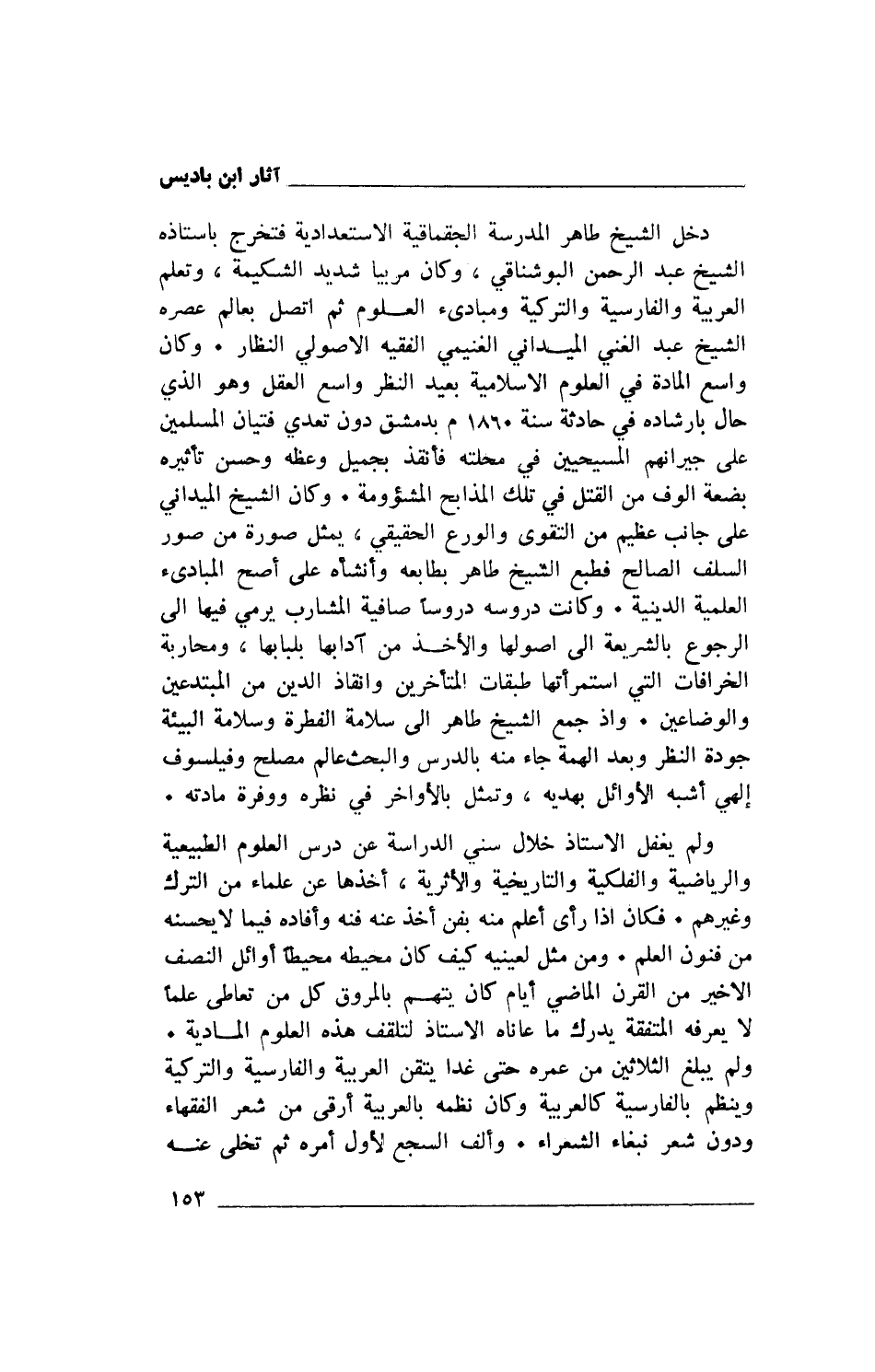 ولم يغفل الأستاذ خلال سني الدراسة عن درس العلوم الطبيعية والرياضية والفلكية والتاريخية والأثرية، أخذها عن علماء من الترك وغيرهم. فكان إذا رأى أعلم منه بفن أخذ عنه فنه وأفاده فيما لايحسنه من فنون العلم. ومن مثل لعينيه كيف كان محيطه محيطاً أوائل النصف الأخير من القرن الماضي أيام كان يتهم بالمروق كل من تعاطى علماً لا يعرفه المتفقة يدرك ما عاناه الأستاذ لتلقف هذه العلوم المادية. ولم يبلغ الثلاثين من عمره حتى غدا يتقن العربية والفارسية والتركية وينظم بالفارسية كالعربية وكان نظمه بالعربية أرقى من شعر الفقهاء ودون شعر نبغاء الشعراء. وألف السجع لأول أمره ثم تخلى عنه