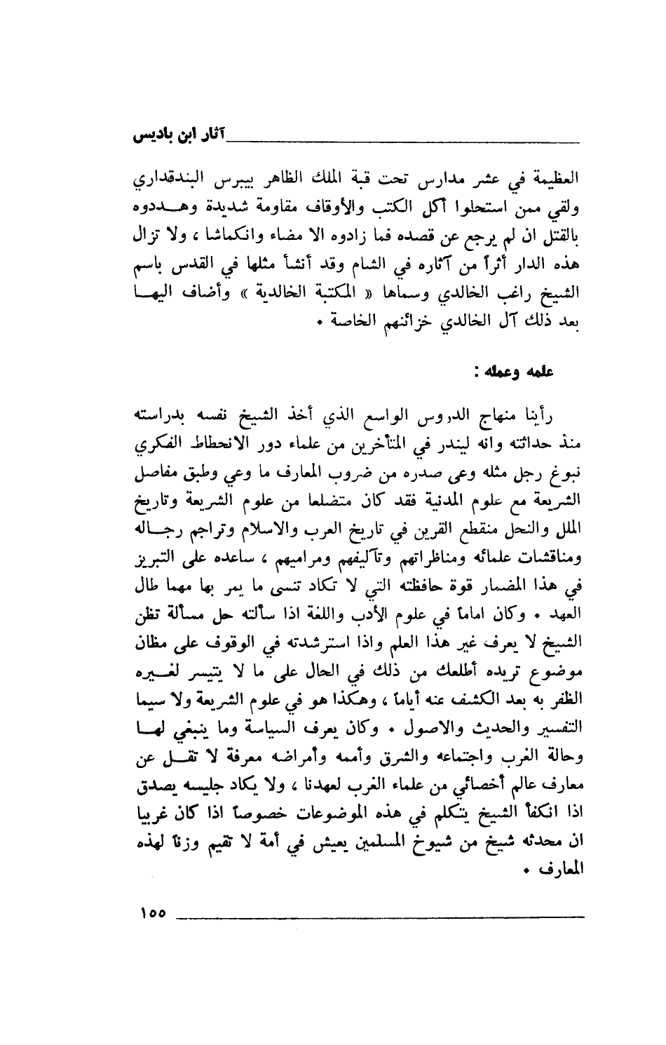 رأينا منهاج الدروس الواسع الذي أخذ الشيخ نفسه بدراسته منذ حداثته وأنه ليندر في المتأخرين من علماء دور الانحطاط الفكري نبوغ رجل مثله وعى صدره من ضروب المعارف ما وعي وطبق مفاصل الشريعة مع علوم المدنية فقد كان متضلعا من علوم الشريعة وتاريخ الملل والنحل منقطع القرين في تاريخ العرب والإسلام وتراجم رجاله ومناقشات علمائه ومناظراتهم وتآليفهم ومراميهم، ساعده على التبريز في هذا المضمار قوة حافظته التي لا تكاد تنسى ما يمر بها مهما طال العهد. وكان إماماً في علوم الأدب واللغة إذا سألته حل مسألة تظن الشيخ لا يعرف غير هذا العلم وإذا استرشدته في الوقوف على مظان موضوع تريده أطلعك من ذلك في الحال على ما لا يتيسر لغيره الظفر به بعد الكشف عنه أياماً، وهكذا هو في علوم الشريعة ولا سيما التفسير والحديث والأصول. وكان يعرف السياسة وما ينبغي لها وحالة الغرب واجتماعه والشرق وأممه وأمراضه معرفة لا تقل عن معارف عالم أخصائي من علماء الغرب لعهدنا، ولا يكاد جليسه يصدق إذا انكفأ الشيخ يتكلم في هذه الموضوعات خصوصاً إذا كان غربيا أن محدثه شيخ من شيوخ المسلمين يعيش في أمة لا ثقيم وزناً لهذه المعارف.