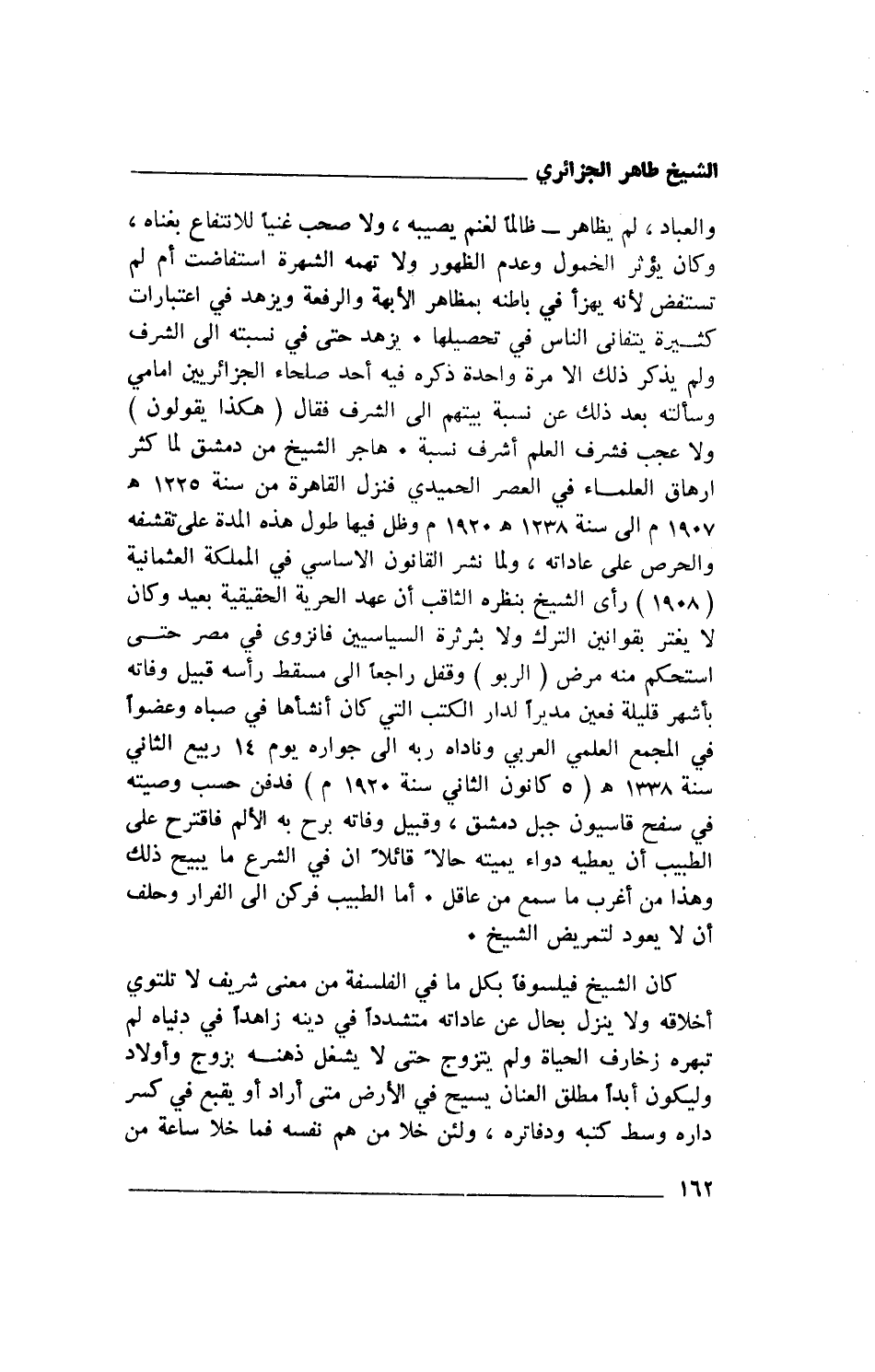والعباد، لم يظاهر- ظالماً لغنم يصيبه، ولا صحب غنياً للانتفاع بغناه، وكان يؤثر الخمول وعدم الظهور ولا تهمه الشهرة استفاضت أم لم تستفض لأنه يهزأ في باطنه بمظاهر الأبهة والرفعة ويزهد في اعتبارات كثيرة يتفانى الناس في تحصيلها. يزهد حتى في نسبته إلى الشرف ولم يذكر ذلك إلا مرة واحدة ذكره فيه أحد صلحاء الجزائريين أمامي وسألته بعد ذلك عن نسبة بيتهم إلى الشرف فقال (هكذا يقولون) ولا عجب فشرف العلم أشرف نسبة. هاجر الشيخ من دمشق لما كثر إرهاق العلماء في العصر الحميدي فنزل القاهرة من سنة 1225ه 1907م إلى سنة 1238ه 1920م وظل فيها طول هذه المدة على تقشفه والحرص على عاداته، ولما نشر القانون الأساسي في المملكة العثمانية (1908) رأى الشيخ بنظره الثاقب أن عهد الحرية الحقيقية بعيد وكان لا يغتر بقوانين الترك ولا بثرثرة السياسيين فانزوى في مصر حتى استحكم منه مرض (الربو) وقفل راجعا إلى مسقط رأسه قبيل وفاته بأشهر قليلة فعين مديراً لدار الكتب التي كان أنشأها في صباه وعضواً في المجمع العلمي العربي وناداه ربه إلى جواره يوم 14 ربيع الثاني سنة 1338ه (5 كانون الثاني سنة 1920م) فدفن حسب وصيته في سفح قاسيون جبل دمشق، وقبيل وفاته برح به الألم فاقترح على الطبيب أن يعطيه دواء يميته حالاً قائلاً أن في الشرع ما يبيح ذلك وهذا من أغرب ما سمع من عاقل. أما الطبيب فركن إلى الفرار وحلف أن لا يعود لتمريض الشيخ.