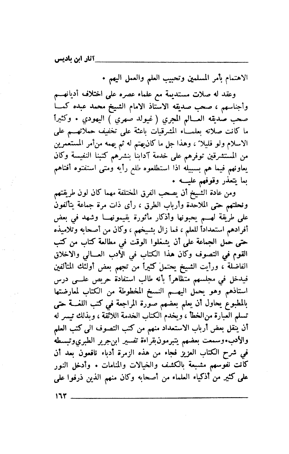 ومن عادة الشيخ أن يصحب الفرق المختلفة مهما كان لون طريقتهم ونحلتهم حتى الملاحدة وأرباب الطرق، رأى ذات مرة جماعة يتألفون على طريقة لهم يحبونها وأذكار مأثورة يقيمونها وشهد في بعض أفرادهم استعداداً للعلم، فما زال بشيخهم، وكان من أصحابه وتلاميذه حتى حمل الجماعة على أن يشغلوا الوقت في مطالعة كتاب من كتب القوم في التصوف وكان هذا الكتاب في الأدب العالي والأخلاق الفاضلة، ورأيت الشيخ يحتمل كثيراً من تجهم بعض أولئك المتألفين فيدخل في مجلسهم متظاهراً بأنه طالب استفادة حريص على درس أستاذهم وهو يحمل إليهم النسخ المخطوطة من الكتاب لمعارضتها بالمطبوع يحاول أن يعلم بعضهم صورة المراجعة في كتب اللغة حتى تسلم العبارة من الخطأ، ويخدم الكتاب الخدمة اللائقة، وبذلك تيسر له أن ينقل بعض أرباب الاستعداد منهم من كتب التصوف إلى كتب العلم والأدب. وسمعت بعضهم يتبرمون بقراءة تفسير ابن جرير الطبري وتبسطه في شرح الكتاب العزيز فجاء من هذه الزمرة أدباء نافعون بعد أن كانت نفوسهم مشبعة بالكشف والخيالات والمنامات. وأدخل النور على كثير من أذكياء العلماء من أصحابه وكان منهم الذين ذرفوا على