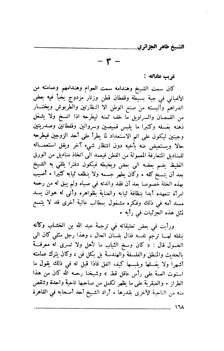 ورأيت في بعض تعليقاته في ترجمة عبد الله بن الخشاب وكأنه بنقله لها ترجم نفسه فقال بلسان الحال، وهذا رجل مثلي كان إلى الخمول قال: "كان وسخ الثياب ما تأهل ولا تسرى له معرفة بالحديث والمنطق والفلسفة والهندسة بل بكل فن، وكان يترك عمامته أشهرا ولا يغسلها ويلبسها كيف اتفق فإذا قيل له في ذلك يقول ما استوت العمة على رأس عاقل قط" وشيخنا رحمه الله كان من هذا الطراز. والعبقرية على ما يظهر تكمل من صاحبها ناحية واحدة وتنقص منه من الناحية الأخرى بقدرها. أراد الشيخ أحد أصحابه في القاهرة
