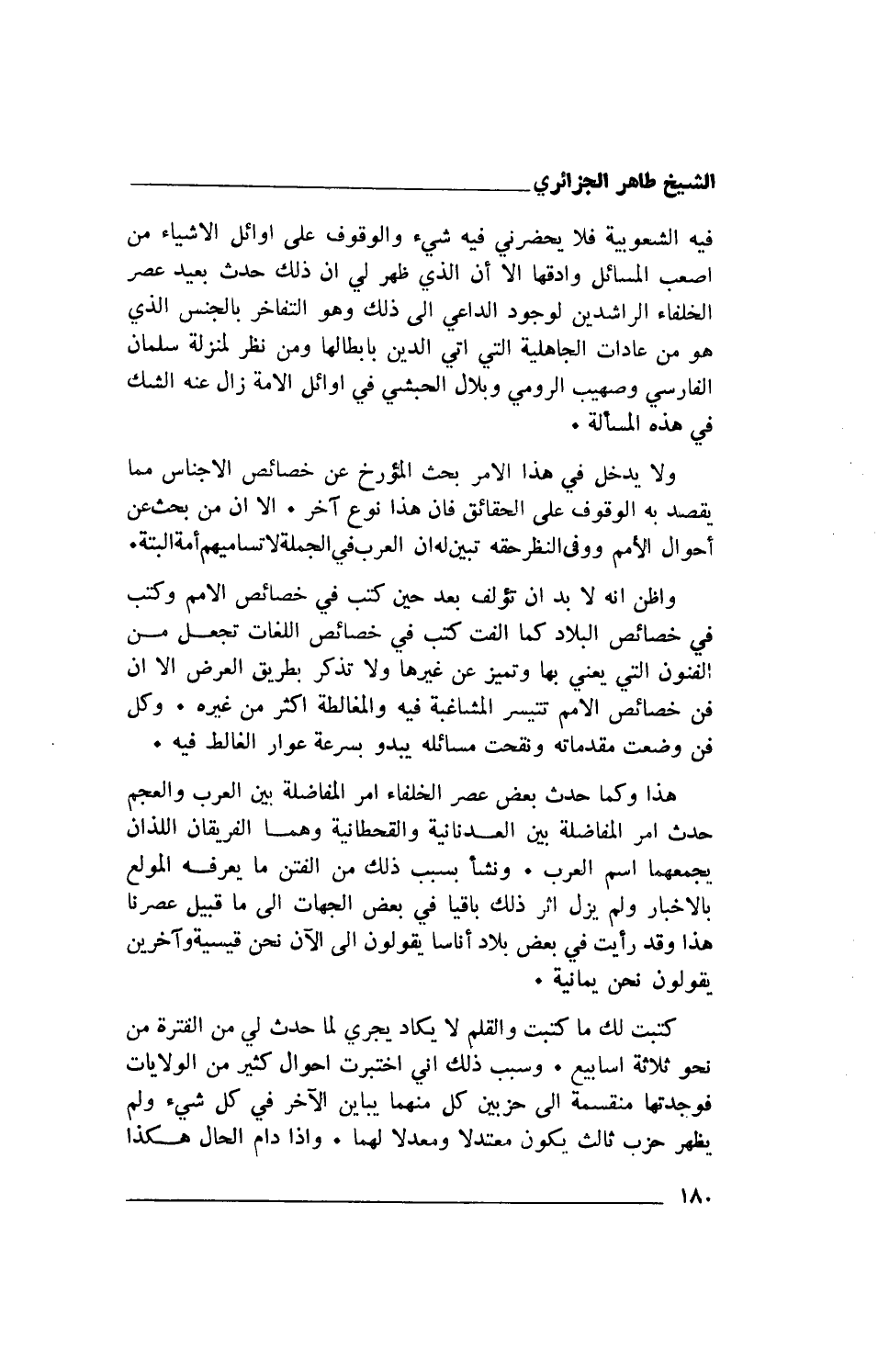 ولا يدخل في هذا الأمر بحث المؤرخ عن خصائص الأجناس مما يقصد به الوقوف على الحقائق فإن هذا نوع آخر. إلا أن من بحث عن أحوال الأمم ووفى النظر حقه تبين له أن العرب في الجملة لا تساميهم أمة البتة.