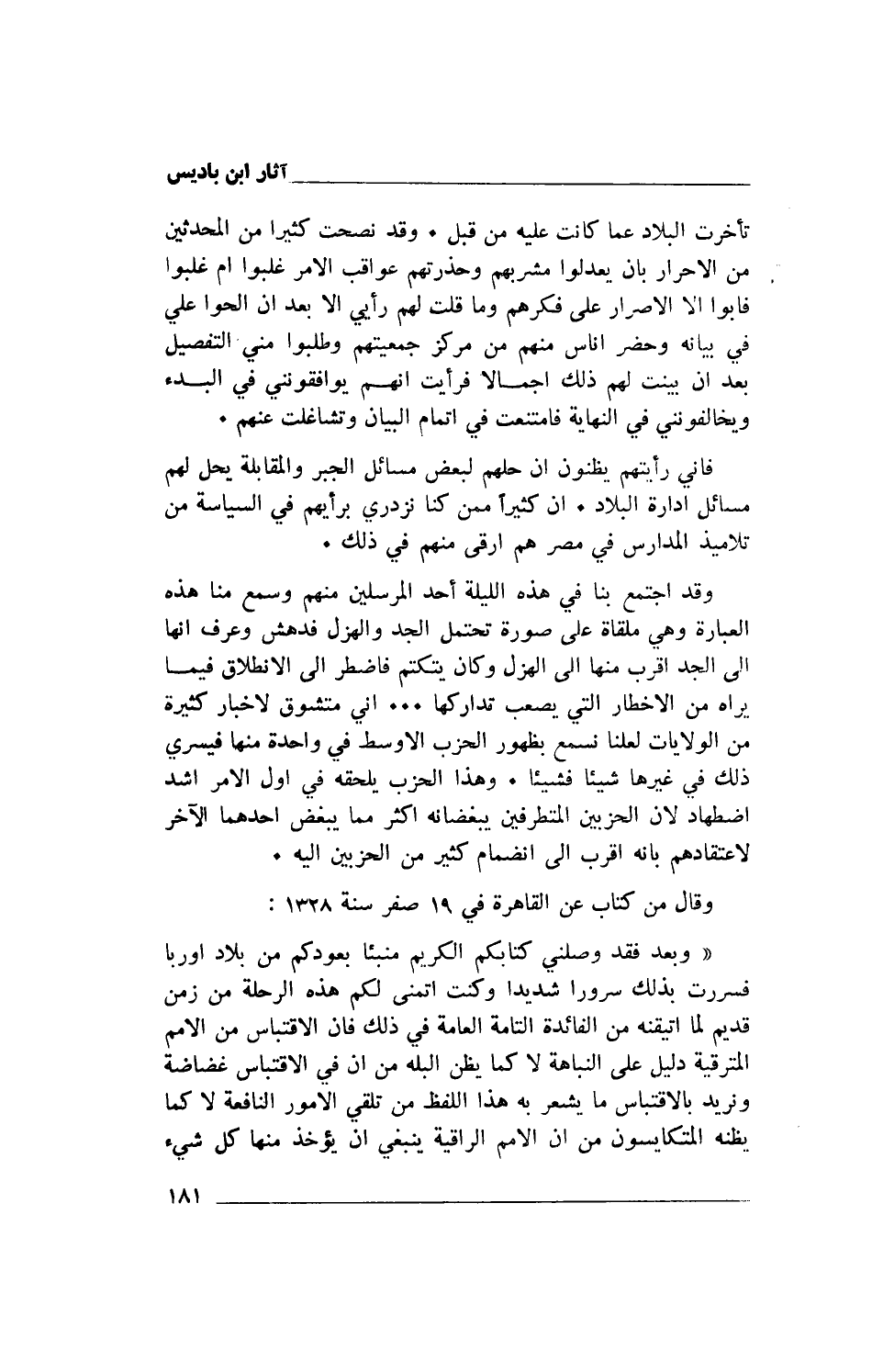 تأخرت البلاد عما كانت عليه من قبل. وقد نصحت كثيرا من المحدثين من الأحرار بأن يعدلوا مشربهم وحذرتهم عواقب الأمر غلبوا أم غلبوا فأبوا إلا الإصرار على فكرهم وما قلت لهم رأيي إلا بعد أن ألحوا علي في بيانه وحضر اناس منهم من مركز جمعيتهم وطلبوا مني التفصيل بعد أن بينت لهم ذلك إجمالا فرأيت أنهم يوافقونني في البدء ويخالفونني في النهاية فامتنعت في إتمام البيان وتشاغلت عنهم.