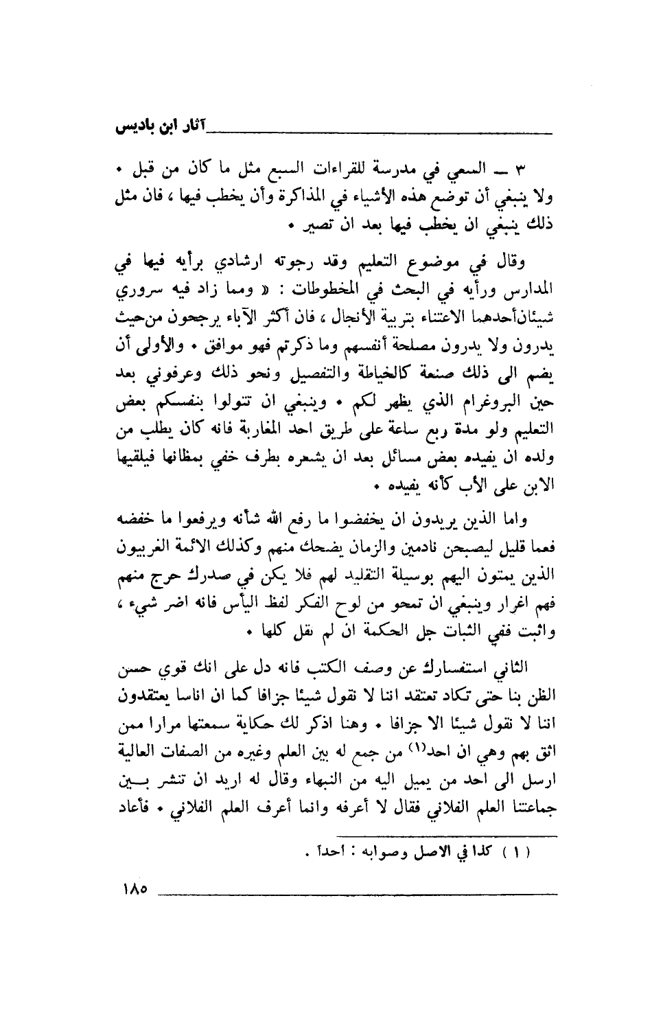 وقال في موضوع التعليم وقد رجوته إرشادي برأيه فيها في المدارس ورأيه في البحث في المخطوطات: "ومما زاد فيه سروري شيئان أحدهما الاعتناء بتربية الأنجال، فإن أكثر الآباء يرجون من حيث يدرون ولا يدرون مصلحة أنفسهم وما ذكرتم فهو موافق. والأولى أن يضم إلى ذلك صنعة كالخياطة والتفصيل ونحو ذلك وعرفوني بعد حين البروغرام الذي يظهر لكم. وينبغي أن تتولوا بنفسكم بعض التعليم ولو مدة ربع ساعة على طربق أحد المغاربة فإنه كان يطلب من ولده أن يفيده بعض مسائل بعد أن يشعره بطرف خفي بمظانها فيلقيها الإبن على الأب كأنه يفيده.