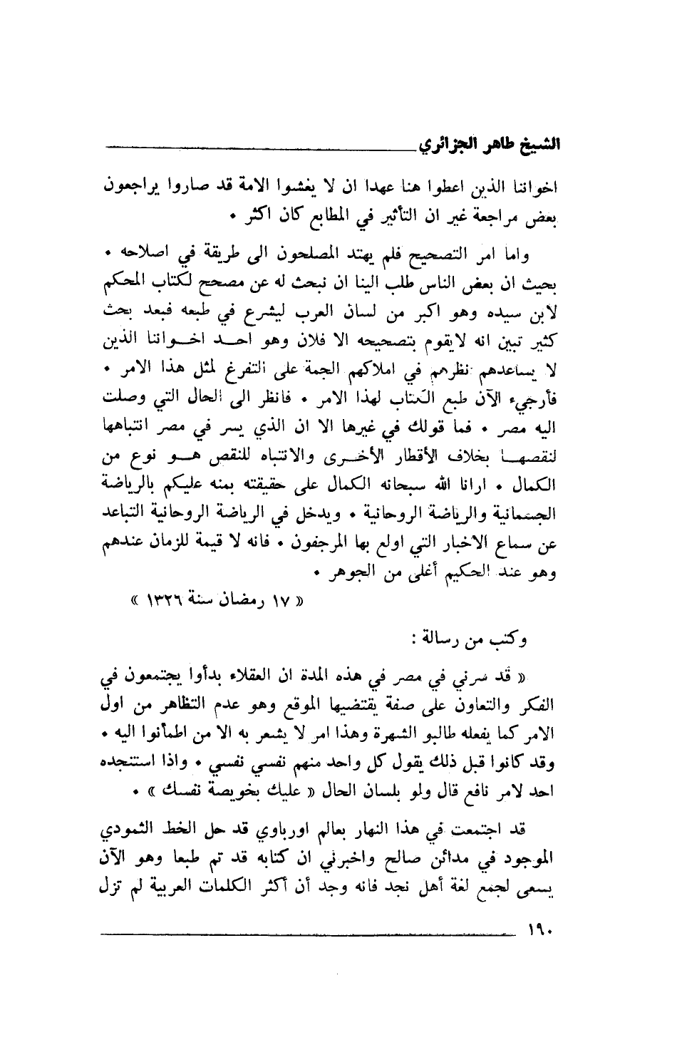 وأما أمر التصحيح فلم يهتد المصلحون إلى طريقة في إصلاحه. بحيث أن بعض الناس طلب إلينا أن نبحث له عن مصحح لكتاب المحكم لابن سيده وهو أكبر من لسان العرب ليشرع في طبعه فبعد بحث كثير تبين أنه لا يقوم بتصحيحه إلا فلان وهو أحد إخواننا الذين لا يساعدهم- نظرهم في أملاكهم الجمة على التفرغ لمثل هذا الأمر. فأرجيء الآن طبع الكتاب لهذا الأمر. فانظر إلى الحال التي وصلت إليه مصر. فما قولك في غيرها إلا أن الذي يسر في مصر انتباهها لنقصها بخلاف الأقطار الأخرى والانتباه للنقصهو نوع من الكمال. أرانا الله سبحانه الكمال على حقيقته بمنه عليكم بالرياضة الجسمانية والرياضة الروحانية. ويدخل في الرياضة الروحانية التباعد عن سماع الأخبار التي أولع بها المرجفون. فإنه لا قيمة للزمان عندهم وهو عند الحكيم أغلى من الجوهر.