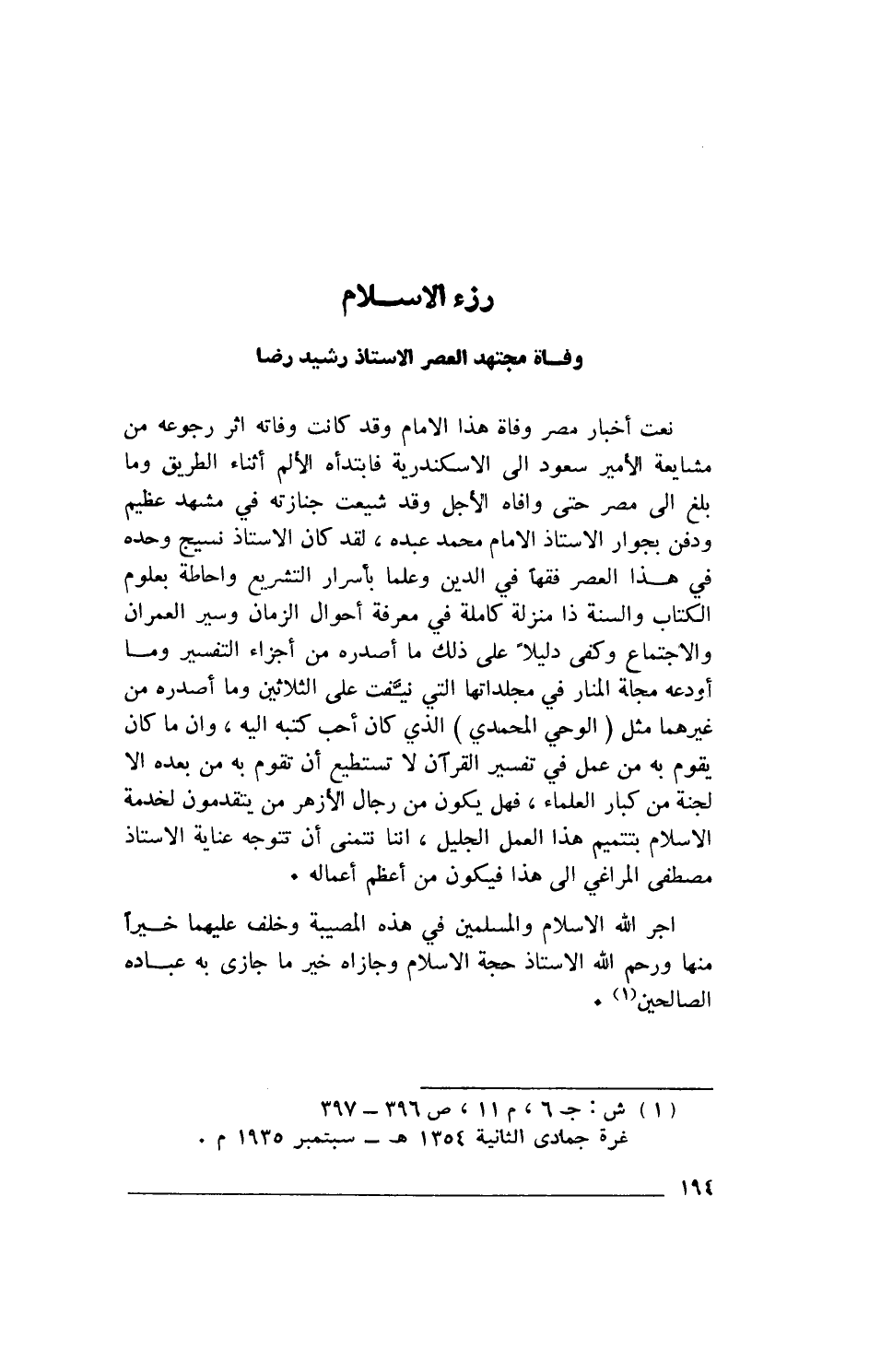 (1) ش: ج 6، م 11، ص 396 - 397 غرة جمادى الثانية 1354ه - سبتمبر 1935م.