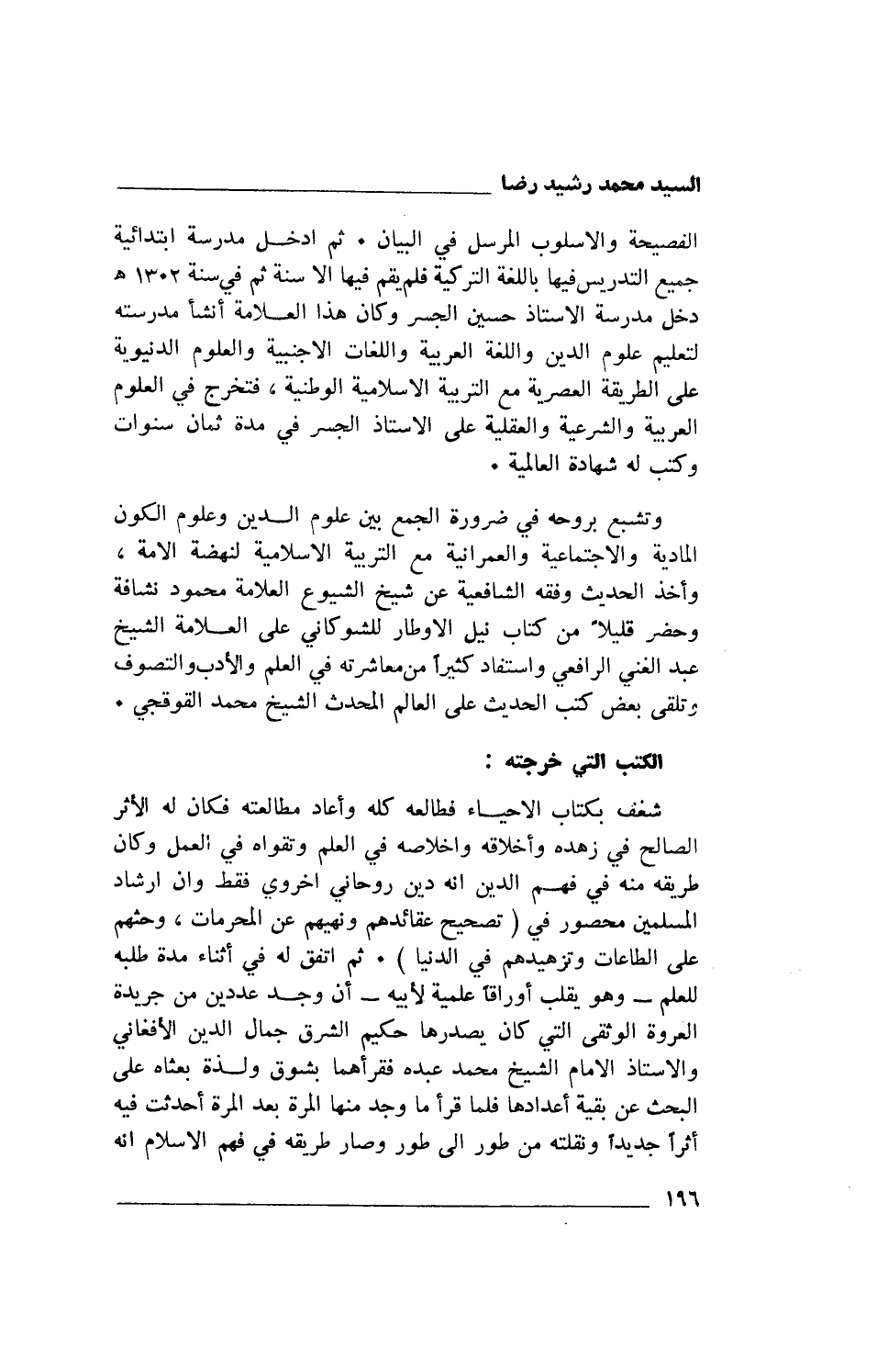 شغف بكتاب الإحياء فطالعه كله وأعاد مطالعته فكان له الأثر الصالح في زهده وأخلاقه وإخلاصه في العلم وتقواه في العمل وكان طريقه منه في فهم الدين أنه دين روحاني أخروي فقط وأن إرشاد المسلمين محصور في (تصحيح عقائدهم ونهيهم عن المحرمات، وحثهم على الطاعات وتزهيدهم في الدنيا). ثم اتفق له في أثناء مدة طلبه للعلم- وهو يقلب أوراقاً علمية لأبيه- أن وجد عددين من جريدة العروة الوثقى التي كان يصدرها حكيم الشرق جمال الدين الأفغاني والأستاذ الإمام الشيخ محمد عبده فقرأهما بشوق ولذة بعثاه على البحث عن بقية أعدادها فلما قرأ ما وجد منها المرة بعد المرة أحدثت فيه أثراً جديداً ونقلته من طور إلى طور وصار طريقه في فهم الإسلام أنه