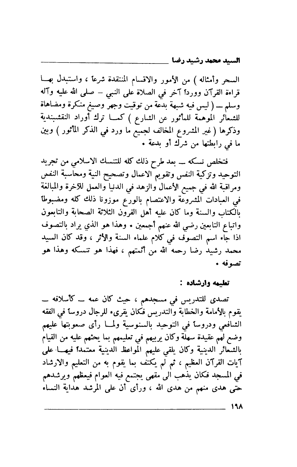 السحر وأمثاله) من الأمور والأقسام المنتقدة شرعاً، واستبدل بها قراءة القرآن وورداً آخر في الصلاة على النبي- صلى الله عليه وآله وسلم- (ليس فيه شبهة بدعة من توقيت وجهر وصيغ منكرة ومضاهاة للشعائر الموهمة للمأثور عن الشارع) كما ترك أوراد النقشبندية وذكرها (غير المشروع المخالف لجميع ما ورد في الذكر المأثور) وبين ما في رابطتها من شرك أو بدعة.