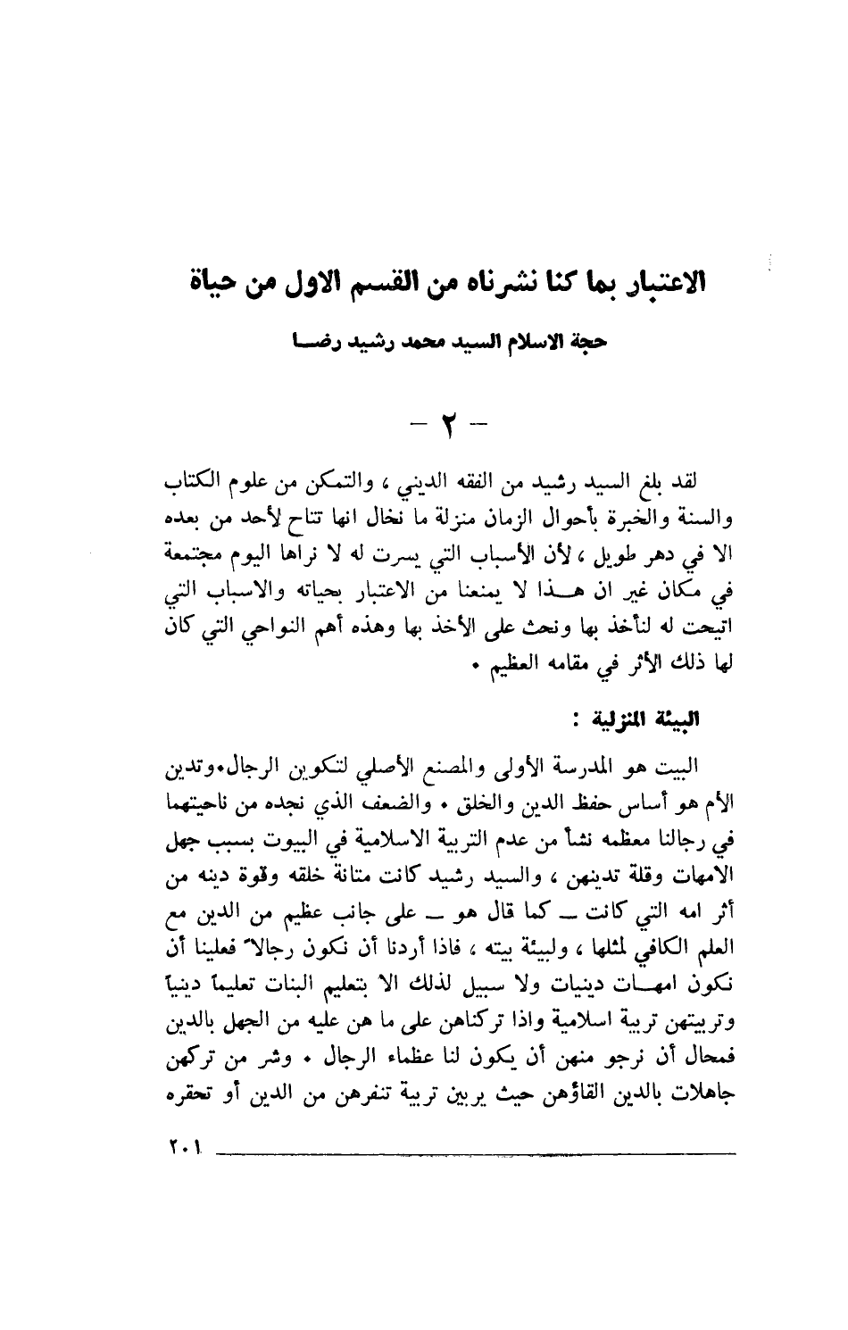 البيت هو المدرسة الأولى والمصنع الأصلي لتكوين الرجال. وتدين الأم هو أساس حفظ الدين والخلق. والضعف الذي نجده من ناحيتهما في رجالنا معظمه نشأ من عدم التربية الإسلامية في البيوت بسبب جهل الأمهات وقلة تدينهن، والسيد رشيد كانت متانة خلقه وقوة دينه من أثر أمه التي كانت- كما قال هو- على جانب عظيم من الدين مع العلم الكافي لمثلها، ولبيئة بيته، فإذا أردنا أن نكون رجالاً فعلينا أن نكون أمهات دينيات ولا سبيل لذلك إلا بتعليم البنات تعليماً دينياً وتربيتهن تربية إسلامية وإذا تركناهن على ما هن عليه من الجهل بالدين فمحال أن نرجو منهن أن يكون لنا عظماء الرجال. وشر من تركهن جاهلات بالدين إلقاؤهن حيث يربين تربية تنفرهن من الدين أو تحقره