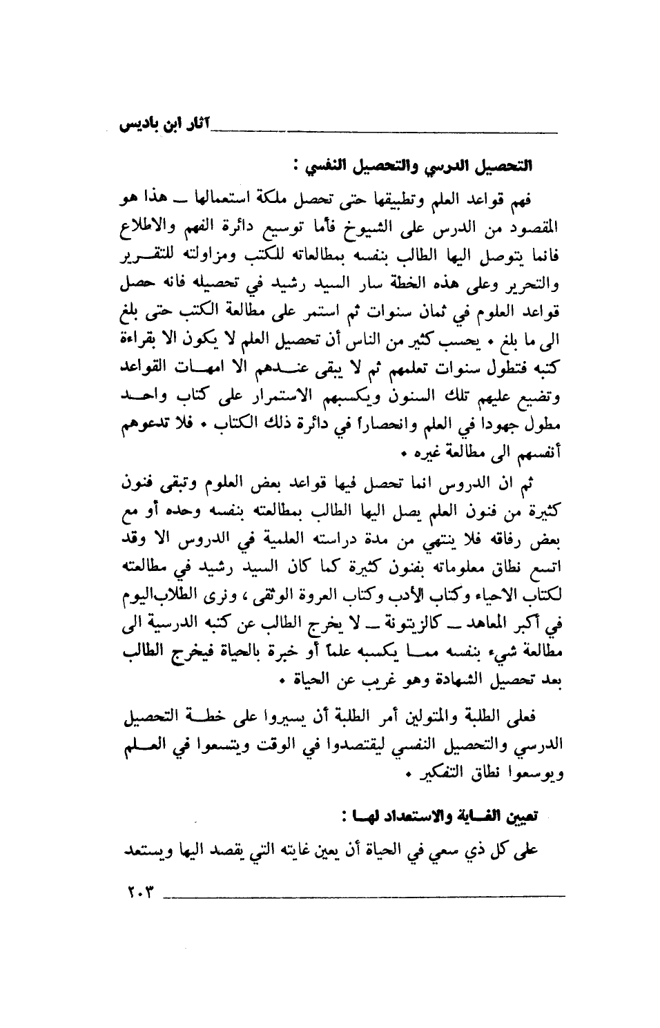 ثم إن الدروس إنما تحصل فيها قواعد بعض العلوم وتبقى فنون كثيرة من فنون العلم يصل إليها الطالب بمطالعته بنفسه وحده أو مع بعض رفاقه فلا ينتهي من مدة دراسته العلمية في الدروس إلا وقد اتسع نطاق معلوماته بفنون كثيرة كما كان السيد رشيد في مطالعته لكتاب الإحياء وكتاب الأدب وكتاب العروة الوثقى، ونرى الطلاب اليوم في أكبر المعاهد- كالزيتونة- لا يخرج الطالب عن كتبه الدرسية إلى مطالعة شيء بنفسه مما يكسبه علماً أو خبرة بالحياة فيخرج الطالب بعد تحصيل الشهادة وهو غريب عن الحياة.