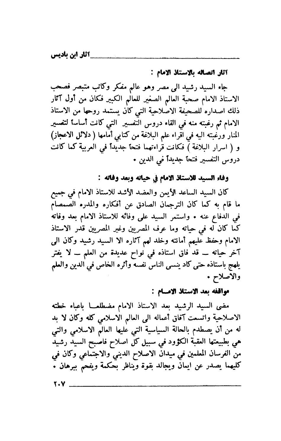 جاء السيد رشيد إلى مصر وهو عالم مفكر وكاتب متبصر فصحب الأستاذ الإمام صحبة العالم الصغير للعالم الكبير فكان من أول آثار ذلك إصداره للصحيفة الإصلاحية التي كان يستمد روحها من الأستاذ الإمام ثم رغبته منه في إلقاء دروس التفسير التي كانت أساساً لتفسير المنار ورغبته إليه في إقراء علم البلاغة من كتابي أمامها (دلائل الإعجاز) و (أسرار البلاغة) فكانت قراءتهما فتحاً جديداً في العربية كما كانت دروس التفسير فتحاً جديداً في الدين.