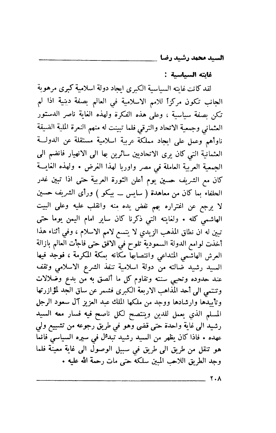 لقد كانت غايته السياسية الكبرى إيجاد دولة إسلامية كبرى مرهوبة الجانب تكون مركزاً للأمم الإسلامية في العالم بصفة دينية إذا لم تكن بصفة سياسية، وعلى هذه الفكرة ولهذه الغاية ناصر الدستور العثماني وجمعية الإتحاد والترقي فلما تبينت له منهم النعرة الملية الضيقة ناوأهم وعمل على إيجاد مملكة عربية إسلامية مستقلة عن الدولة العثمانية التي كان يرى الإتحاديين سائرين بها إلى الإنهيار فانضم إلى الجمعية العربية العاملة في مصر وأوربا لهذا الغرض. ولهذه الغاية كان مع الشريف حسين يوم أعلن الثورة العربية حتى إذا تبين غدر الحلفاء بما كان من معاهدة (سايس- بيكو) ورأى الشريف حسين لا يرجع عن اغتراره بهم نفض يده منه وانقلب عليه وعلى البيت الهاشمي كله. ولغايته التي ذكرنا كان ساير إمام اليمن يوما حتى تبين له أن نطاق المذهب الزيدي لا يتسع لأمم الإسلام، وفي أثناء هذا أخذت لوامع الدولة السعودية تلوح في الأفق حتى فاجأت العالم بإزالة العرش الهاشمي المتداعي وانتصابها مكانه بمكة الكرمة، فوجد فيها السيد رشيد ضالته من دولة إسلامية تنفذ الشرع الإسلامي وتقف عند حدوده وتحيي سنته وتقاوم كل ما ألصق به من بدع وضلالات وتنتمي إلى أحد المذاهب الأربعة الكبرى فشمر عن ساق الجد لمؤازرتها وتأييدها وإرشادها ووجد من ملكها الملك عبد العزيز آل سعود الرجل المسلم الذي يحمل للدين وينتصح لكل ناصح فيه فسار معه السيد رشيد إلى غاية واحدة حتى قضى وهو في طريق رجوعه من تشييع ولي عهده. فإذا كان يظهر من السيد رشيد تبدُّل في سيره السياسي فإنما هو تنقل من طريق إلى طريق في سبيل الوصول إلى غاية معينة فلما وجد الطريق اللاحب المبين سلكه حى مات رحمة الله عليه.
