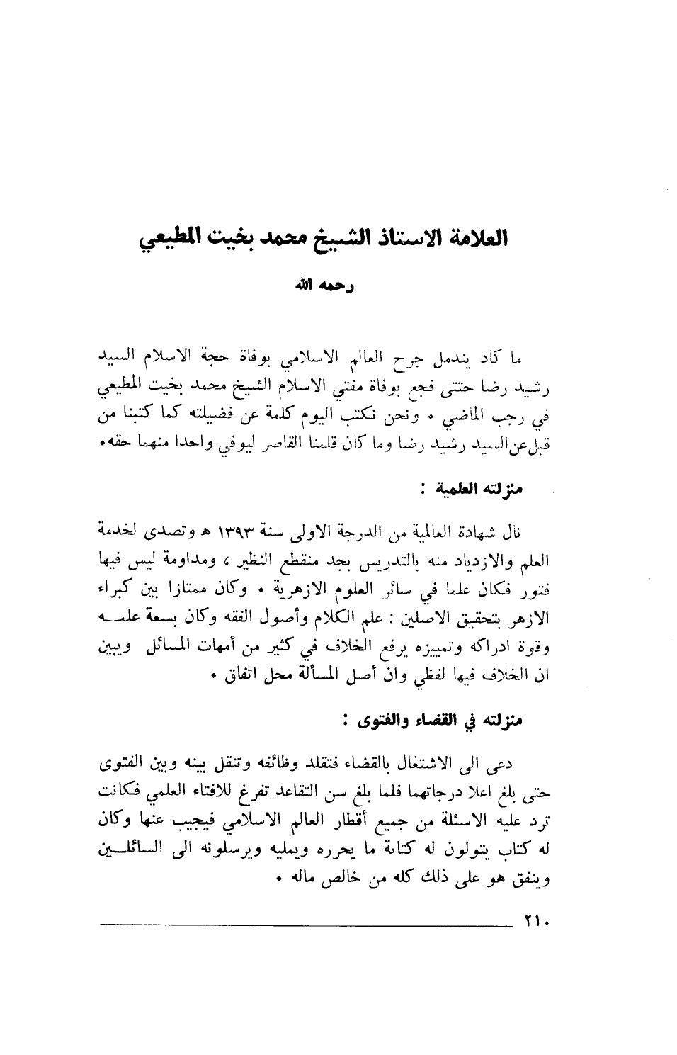 ما كاد يندمل جرح العالم الإسلامي بوفاة حجة الإسلام السيد رشيد رضا حتى فجع بوفاة مفتي الإسلام الشيخ محمد بخيت المطيعي في رجب الماضي. ونحن نكتب اليوم كلمة عن فضيلته كما كتبنا من قبل عن السيد رشيد رضا وما كان قلمنا القاصر ليوفي واحدا منهما حقه.