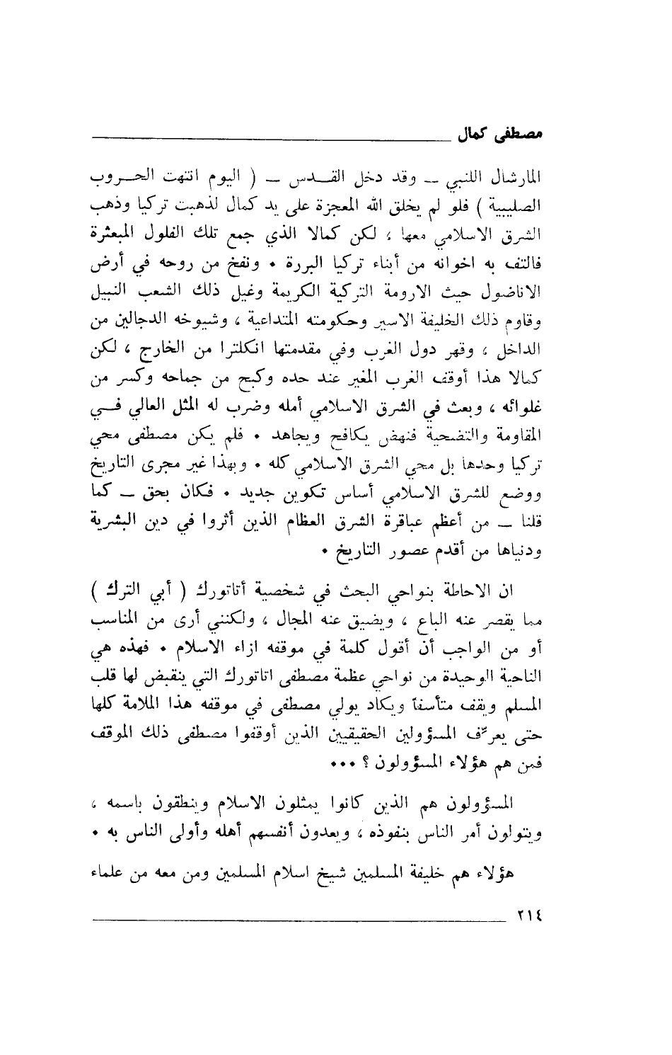 إن الإحاطة بنواحي البحث في شخصية أتاتورك "أبي الترك" مما يقصر عنه الباع، ويضيق عنه المجال، ولكنني أرى من المناسب أو من الواجب أن أقول كلمة في موقفه إزاء الإسلام. فهذه هي الناحية الوحيدة من نواحي عظمة مصطفى أتاتورك التي ينقبض لها قلب المسلم ويقف متأسفاً ويكاد يولي مصطفى في موقفه هذا الملامة كلها حتى يعرِّف المسؤولين الحقيقيين الذين أوقفوا مصطفى ذلك الموقف فمن هم هؤلاء المسؤلون؟ ...