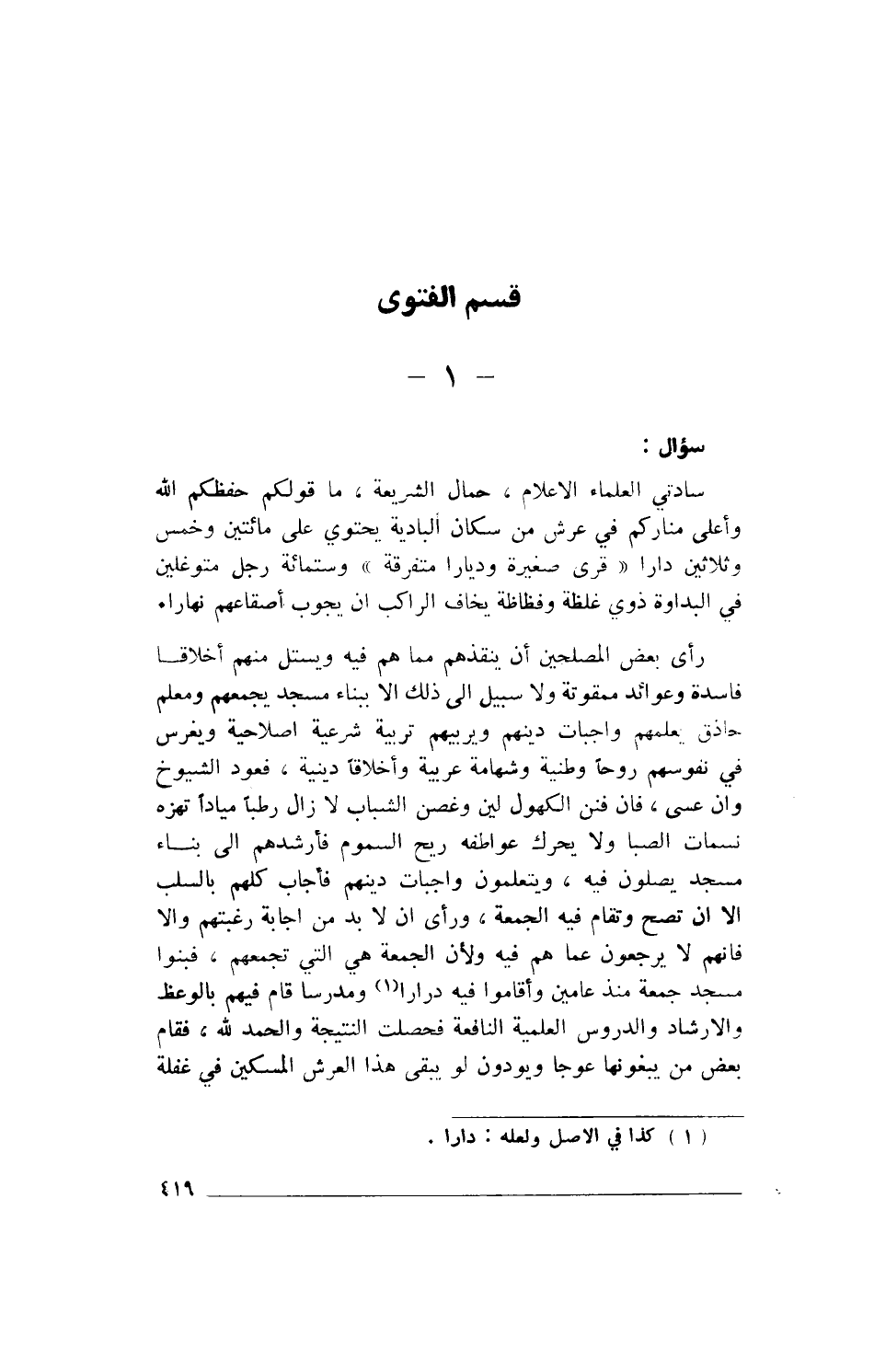 سادتي العلماء الأعلام، حمال الشريعة، ما قولكم حفظكم الله وأعلى مناركم في عرش من سكان البادية يحتوي على مائتين وخمس وثلاثين دارا "قرى صغيرة وديارا متفرقة"، وستمائة رجل متوغلين في البداوة ذوي غلظة وفظاظة يخاف الراكب أن يجوب وأصقاعهم نهارا.