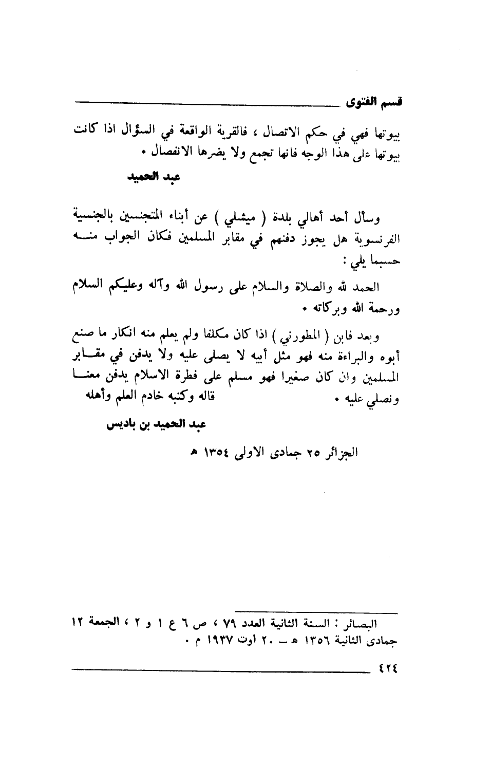 وسأل أحد أهالي بلدة (ميشلي) عن أبناء التجنسين بالجنسية الفرنسوية هل يجوز دفنهم في مقابر المسلمين فكان الجواب منه حسبما يلي: