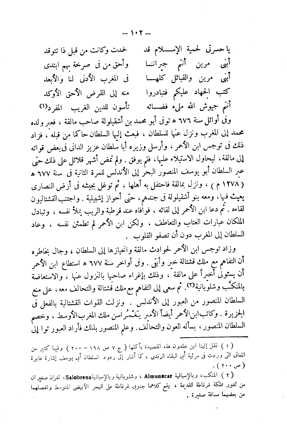 (¬1) نقل إلينا ابن خلدون هذه القصيدة بأكملها (ج 7 ص 198 - 200) وفيها كثير من المعانى التى وردت فى مرثية أبى البقاء الرندى، كما أشار إلى ردود السلطان أبى يوسف إشارة عابرة (ص 200).