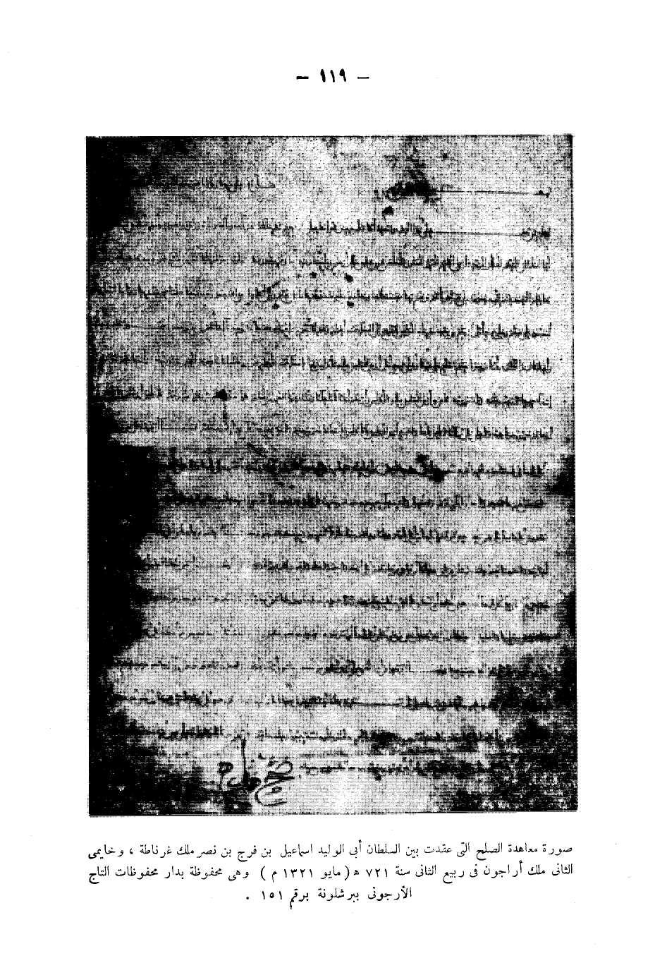صورة معاهدة الصلح التى عقدت بين السلطان أبى الوليد اسماعيل بن فرج بن نصر ملك غرناطة، وخايمى الثانى ملك أراجون فى ربيع الثانى سنة 721 هـ (مايو 1321 م) وهى محفوظة بدار محفوظات التاج الأرجونى ببرشلونة برقم 151.