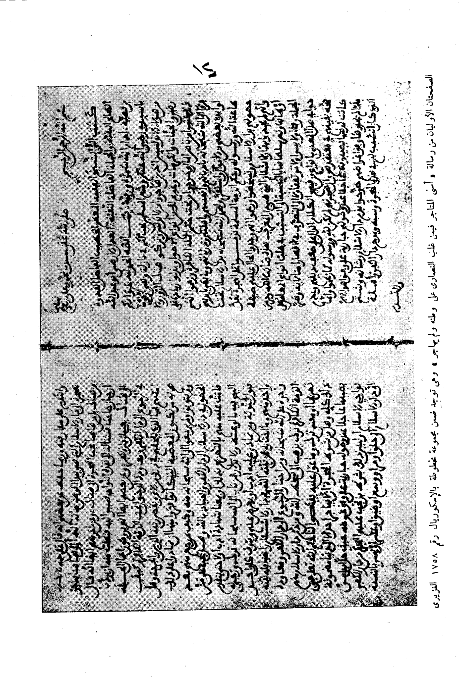 الصفحتان الأوليان من رسالة " أسنى المتاجر فيمن غلب النصارى على وطنه ولم يهاجر " وهي توجد ضمن مجموعة مخطوطة بالإسكوريال رقم 1758 الغزيرى.