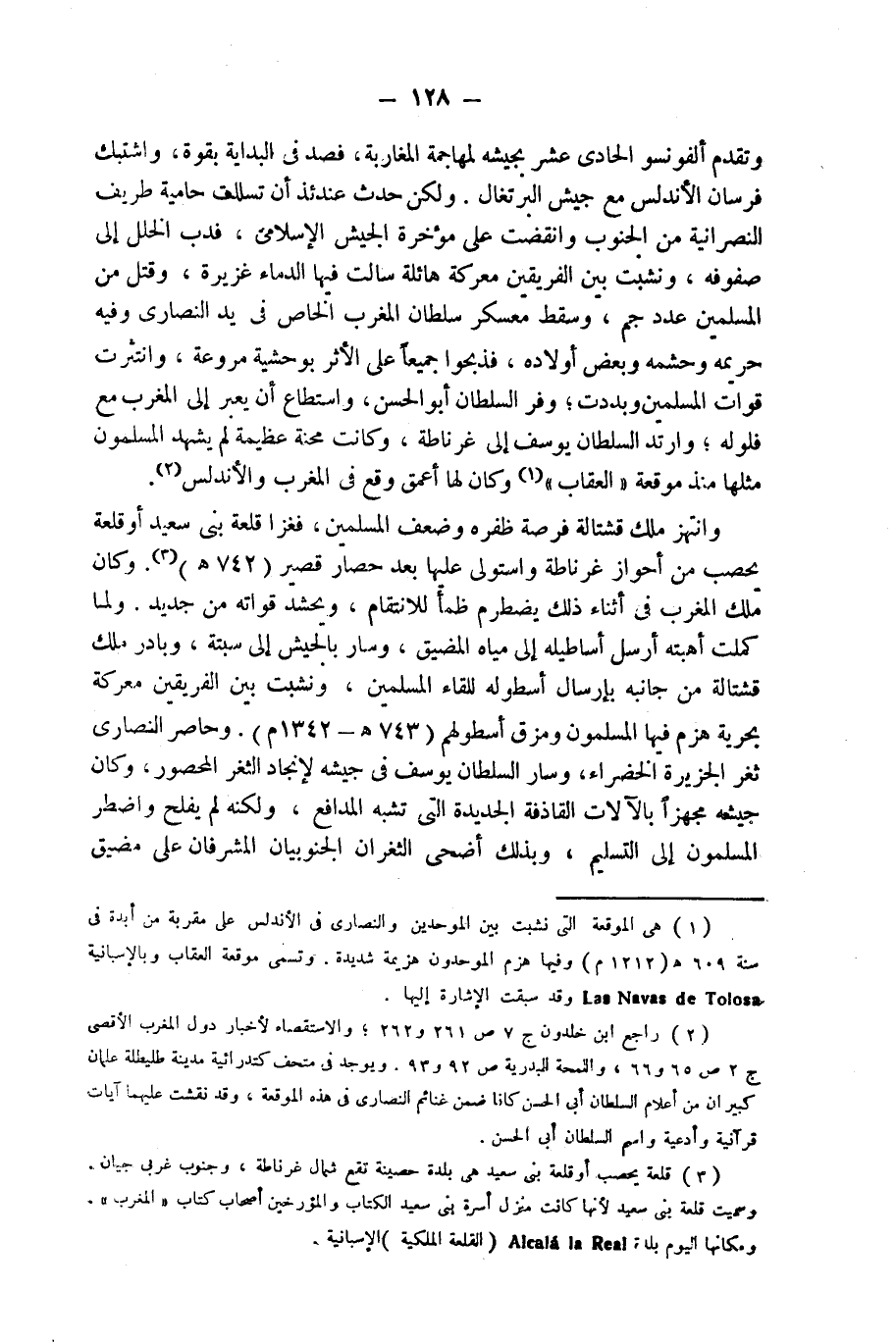 (¬1) هى الموقعة التى نشبت بين الموحدين والنصارى فى الأندلس على مقربة من أبدة فى سنة 609 هـ (1212 م) وفيها هزم الموحدون هزيمة شديدة. وتسمى موقعة العقاب وبالإسبانية Las Navas de Tolosa وقد سبقت الإشارة إليها.