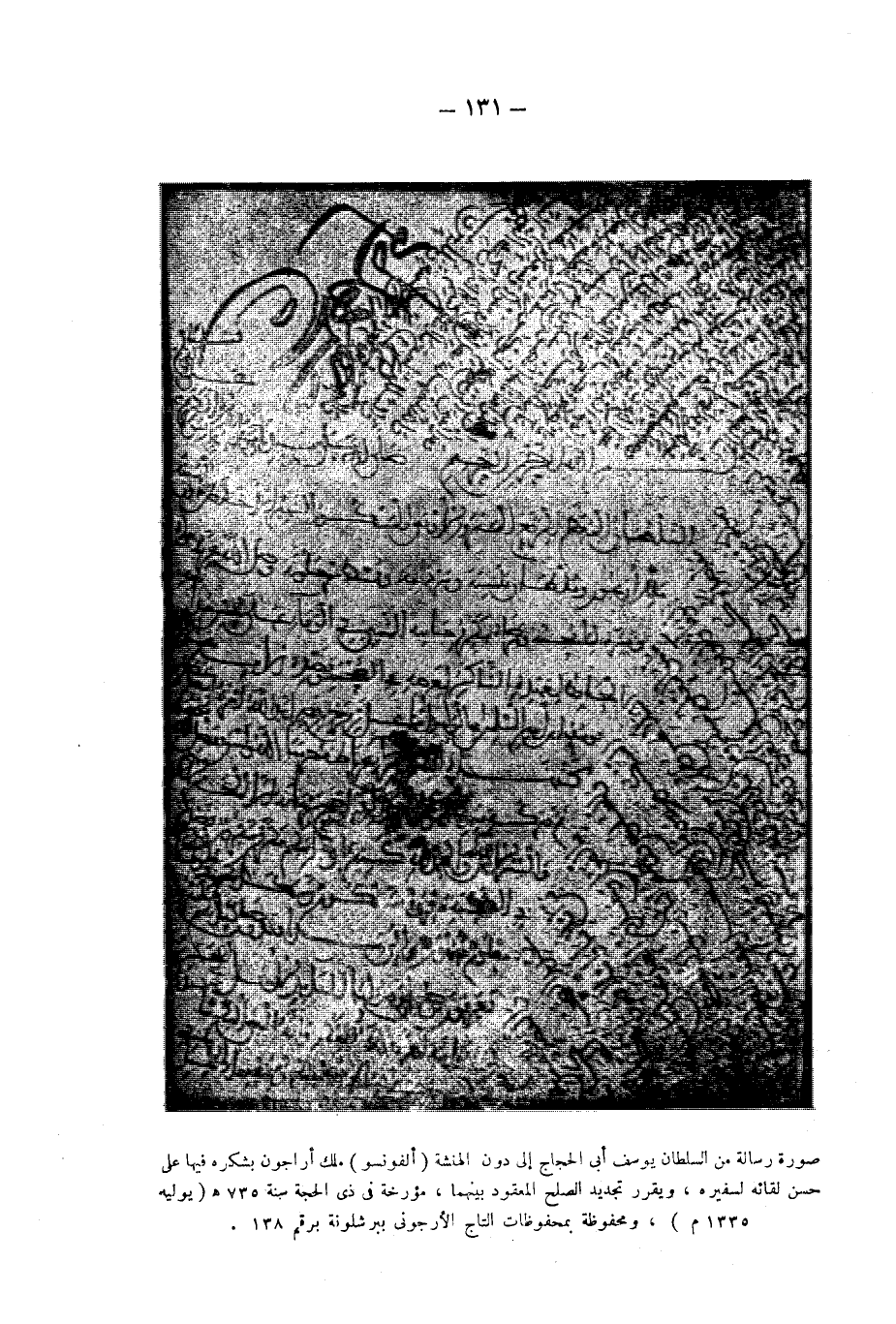 صورة رسالة من السلطان يوسف أبى الحجاج إلى دون المنشة (ألفونسو) ملك أراجون يشكره فيها على حسن لقائه لسفيره، ويقرر تجديد الصلح المعقود بينهما، مؤرخة فى ذى الحجة سنة 735 هـ (يوليه 1335 م) ومحفوظة بمحفوظات التاج الأرجونى ببرشلونة برقم 138.