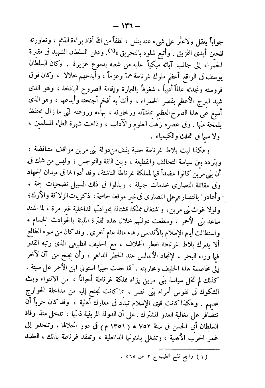 جواباً يعقل ولا عثر على شىء عنه ينقل، لطفاً من الله أفاد براءة الذمم، وتعاورته للحين أيدى التمزيق. وأتبع شلوه بالتحريق" (¬1). ودفن السلطان الشهيد فى مقبرة الحمراء إلى جانب آبائه مبكياً عليه من شعبه بدموع غزيرة. وكان السلطان يوسف فى الواقع أعظم ملوك غرناطة همة وعزماً، وأبدعهم خلالا، وكان فوق فروسته ونجدته عالماً أديباً، شغوفاً بالعمارة وإقامة الصروح الباذخة، وهو الذى شيد البرج الأعظم بقصر الحمراء، وأنشأ به أفخم أجنحته وأبدعها، وهو الذى أسبغ على هذا الصرح العظيم بمنشآته وزخارفه، بهاءه وروعته التى ما زال يحتفظ بلمحة منها. وفى عصره زهت العلوم والآداب، وذاعت شهرة العلماء المسلمين، ولا سيما فى الفلك والكيمياء.