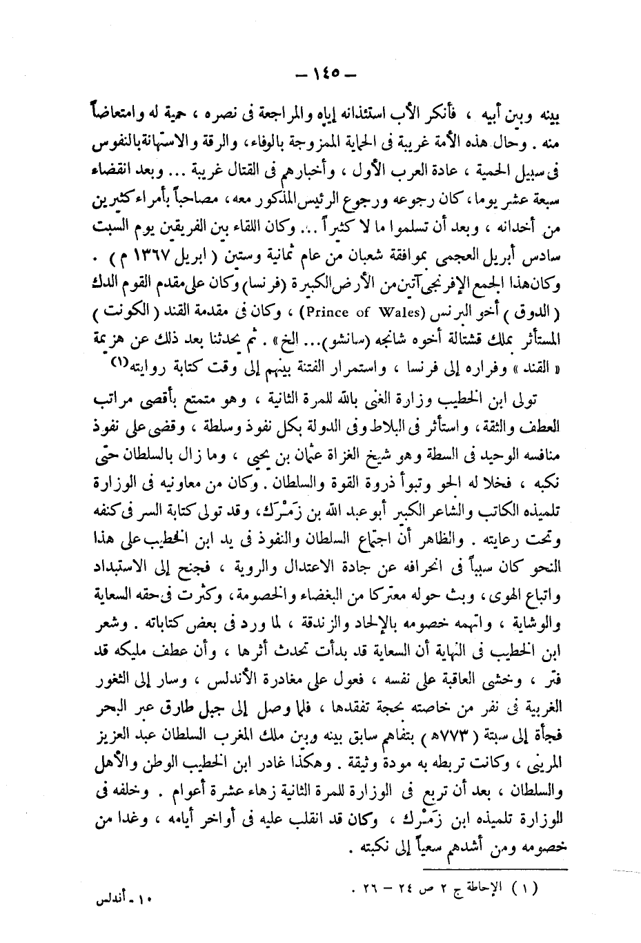 بينه وبين أبيه، فأنكر الأب استئذانه إياه والمراجعة فى نصره، حمية له وامتعاضاً منه. وحال هذه الأمة غريبة فى الحماية الممزوجة بالوفاء، والرقة والاستهانة بالنفوس فى سبيل الحمية، عادة العرب الأول، وأخبارهم فى القتال غريبة ... وبعد انقضاء سبعة عشر يوما، كان رجوعه ورجوع الرئيس المذكور معه، مصاحباً بأمراء كثيرين من أخدانه، وبعد أن تسلموا مالا كثيراً ... وكان اللقاء بين الفريقين يوم السبت سادس أبريل العجمى بموافقة شعبان من عام ثمانية وستين (ابريل 1367 م).