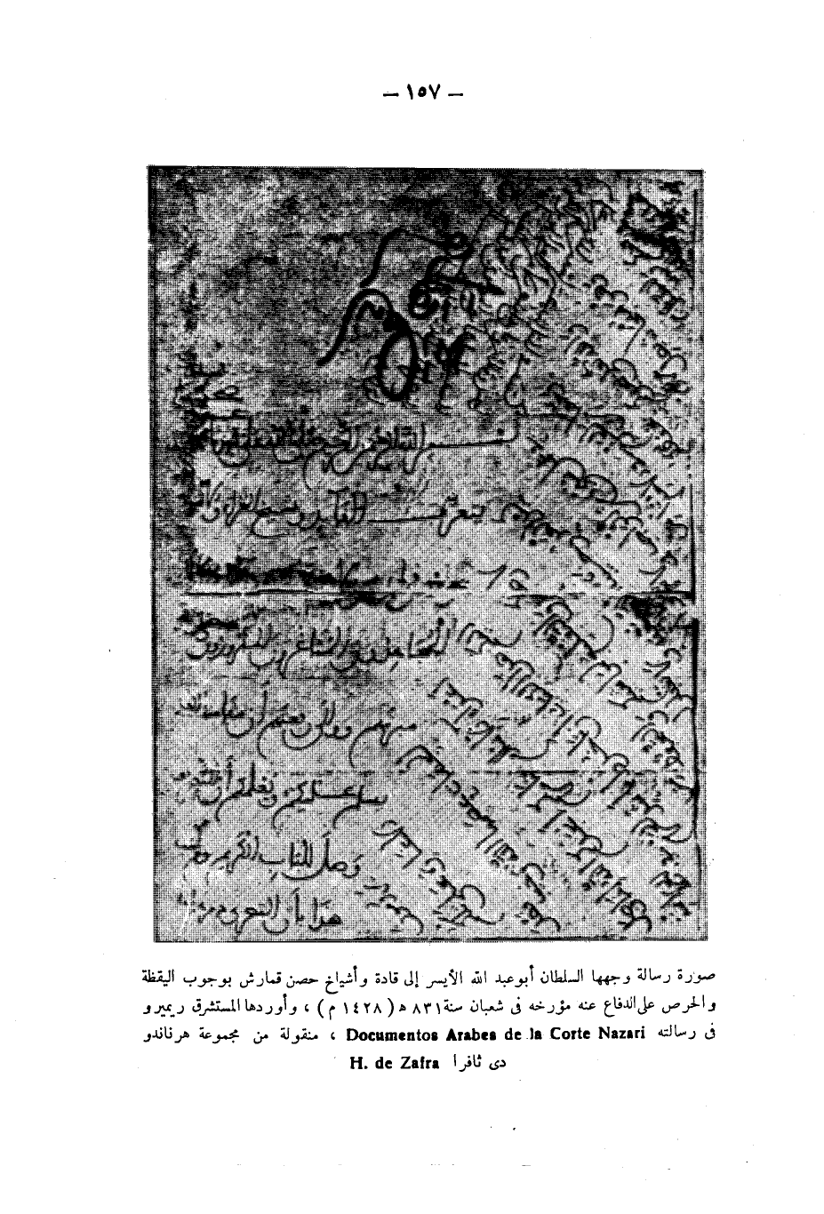 صورة رسالة وجهها السلطان أبو عبد الله الأيسر إلى قادة وأشياخ حصن قمارش بوجوب اليقظة والحرص على الدفاع عنه مؤرخة فى شعبان سنة 831 هـ (1428 م)، وأوردها المستشرق ريميرو فى رسالته Documentos Arabes de la Corte Nazari، منقولة من مجموعة هرناندو دى ثافرا H. de Zafra